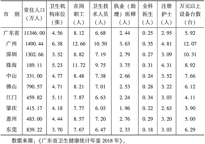 表3 大湾区广东九市各市每千常住人口床位、人员、设备情况(2018年)