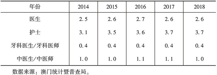 第二,澳门医护人员相对缺乏。虽然澳门的基层医疗相对成熟,但医疗可及性并不高。如表2所示,2018年澳门每千人口与医生比例为1∶2.6,但每千人口与西医比例仅为1∶1.6,低于广东省每千常住人口与执业(助理)医师(人)的比例(1∶2.44);澳门每千人口与护士比例为1∶3.7,高于广东省每千人口与护士比例(1∶2.95),但低于广州市每千人口与护士比例(1∶4.81)和珠海市每千人口与护士比例(1∶4.31)。