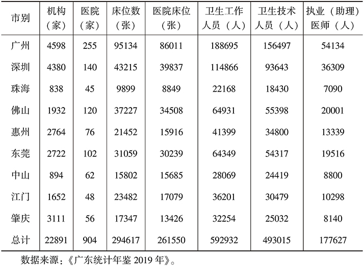 表1 大湾区广东九市各市医疗卫生机构、床位和人员数(2019年)