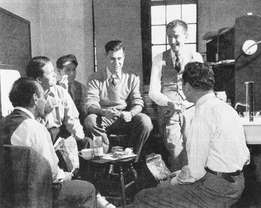 图8-5 马克斯·德尔布吕克和噬菌体研究小组成员,1949年;从左到右依次为:让·魏格尔、奥勒·马洛、埃利·沃尔曼、冈特·施坦特、马克斯·德尔布吕克和G.索利
