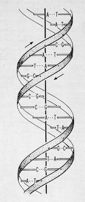 图1-3 双螺旋结构示意图。两条糖-磷酸链条缠绕在外侧,扁平的氢键碱基对构成核心。从这个角度看,双螺旋结构就像一个由碱基对构成台阶的螺旋楼梯。(画家:奥迪尔·克里克,1953年)