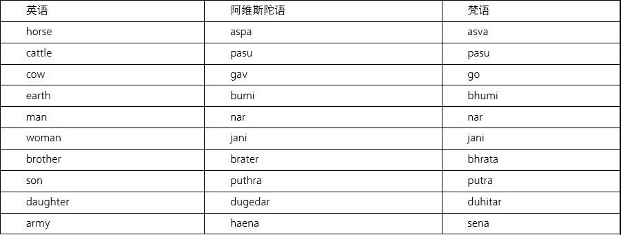 这些雅利安人,或者按现在更常见的称呼,原始伊朗人,讲阿维斯陀语。它是印欧语系伊朗语族中最古老的语言之一,亦是梵语的姊妹语言。它是古波斯语的直接前身。阿维斯陀语和梵语这两种古语言语义上的相似性尤为明显,这表明,伊朗和印度的雅利安人有着共同的起源。不妨参考以下单词列表,注意它们共同的音值: