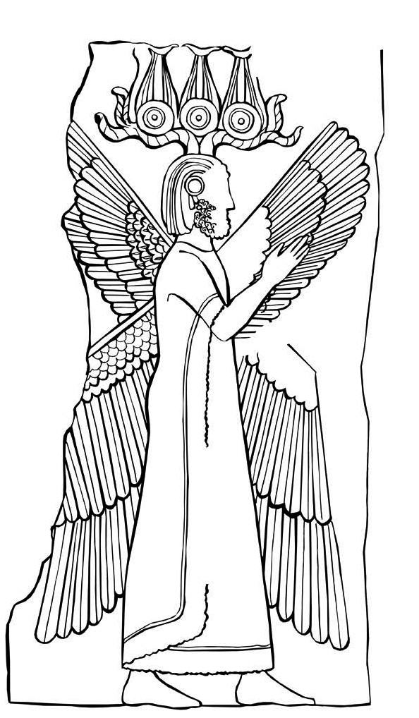 居鲁士征服吕底亚后不久便开始改造帕萨尔加德王宫和花园,因为萨迪斯和其他伊奥尼亚城市的宏伟壮观给他留下了深刻的印象。因此希腊石匠被派往帕尔斯,一起策划修建波斯的第一批石制建筑。从考古发掘来看,在居鲁士决定于帕萨尔加德大兴土木之前,该地尚未有永久性的定居点,尽管数个世纪以来,该地一直是重要的部落集会场所。米底人早就知道这个地方,在他们攻占波斯期间,帕萨尔加德成了他们的驻军哨所,被他们称为Badrakatash。但对波斯人来说,它叫作Pathragada,意为“挥舞重棒之人的居所”。居鲁士认为,他的新帝国值得,也需要一个仪式性中心,尽管他从未筹划将帕萨尔加德建造得像波斯波利斯那般规模壮阔,但也计划将它打造为波斯帝国新树立的王权中心。帕萨尔加德地处穆尔加布平原(Dasht-e Morghab,意为水鸟之原),在设拉子以北约55英里处,靠近普勒瓦尔河,在昔日来往于埃克巴坦那和波斯湾的繁忙商队路线上,海拔超过2000英尺。今天,它是一处安静、偏远的考古遗址,参观它的游客需要具备充沛的想象力。它的遗迹稀少而分散,我们很难深入了解它。尽管我们对用石材修建、大理石装饰的王室宫殿多有记录和研究,但事实上我们尚未解开波斯帝国这个宏伟、庞大的遗址的全部谜团。如今只有几根断柱和一些开裂的石板依稀可以显现出居鲁士王宫中那座雅致亭子的位置。亭子的废墟旁矗立着一道过去肯定十分辉煌的丰碑式大门。它是整个王宫建筑群的唯一入口,但它昔日的恢宏如今只能从一根饰有高浮雕的立式门柱上窥见一二。这根门柱上雕刻了一名男性,他背生四翼,身着埃兰式长袍,头戴精致的埃及式王冠——一件高耸的“女神游乐厅”(Folies-Bergère,法国巴黎的一家咖啡馆-音乐厅)风格的精致工艺品,由鸵鸟羽毛、猎鹰羽毛和弯曲的公羊角制成。(图3)数个世纪以来,这个奇特的复合人物形象一直被认为是居鲁士大帝本人的形象,但事实并非如此。天使般的翅膀表明,他是亚述的守护神,被称为“阿普卡鲁”(apkallu)。这种天使般的存在通常出现在新亚述王宫的城墙和门柱上,扮演神圣的监督者或某种天界守卫的角色,负责阻止天界的不速之客进入王宫,防止宇宙中不受欢迎的存在给王宫居住者带来伤害或麻烦。当他被移交到帕萨尔加德,进行波斯化改造后,带翼的阿普卡鲁便成为一个尊贵但令人敬畏的神灵,是帕萨尔加德防御系统的一部分。阿普卡鲁会确保居鲁士不受任何邪恶力量的伤害。