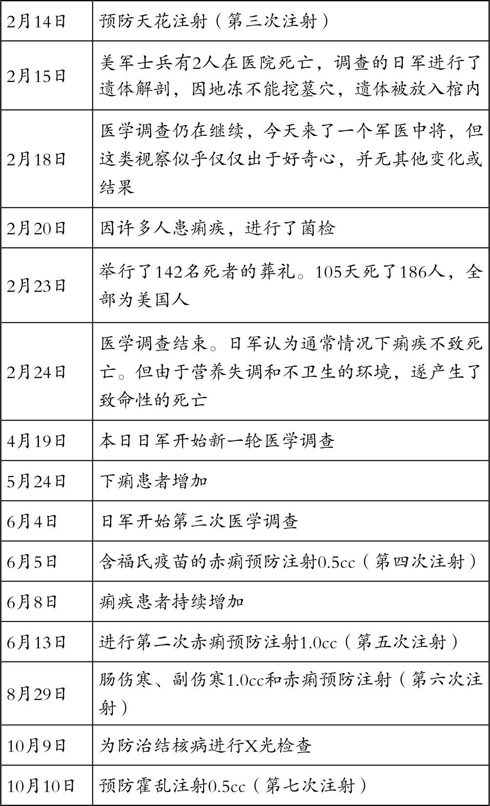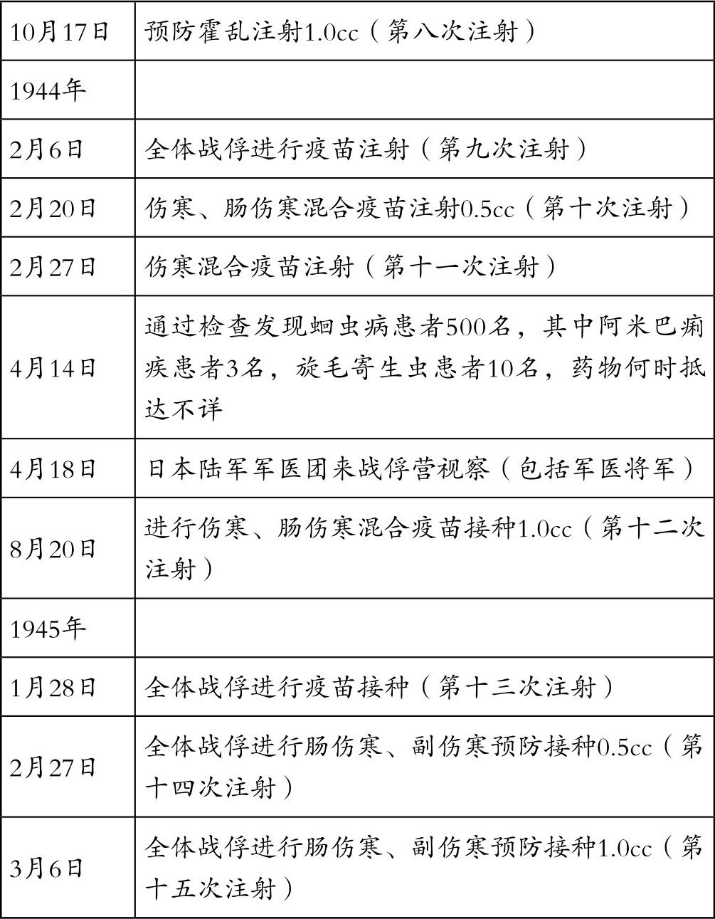 表2是从军医皮蒂少校的日记中,关于预防接种的表中选出来的。按照其记录,在12个月中竟然进行了15次这种预防接种。没有食物和医院,是所有战俘营的通病。如果说是为了预防传染病而进行的预防注射,看来缺乏说服力。甚至对战俘进行了蛔虫调查,但没有给战俘这方面的药。