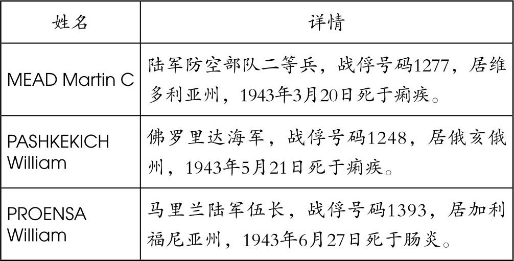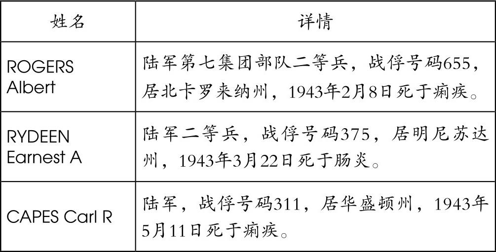 表1中,记录的这6名死亡战俘的死因为痢疾和肠炎,没有写明伤寒。根据皮蒂日记,在731部队来之前的1月30日,战俘们都接受了伤寒混合A型的预防接种。克里斯蒂的儿子毛里斯从美军埋葬战死者援助局,查阅到1943年2月至6月,在奉天陆军医院死亡的6名美军战俘的姓名、单位、住所、死亡时间以及死因等资料,并把这些资料提供给了笔者。