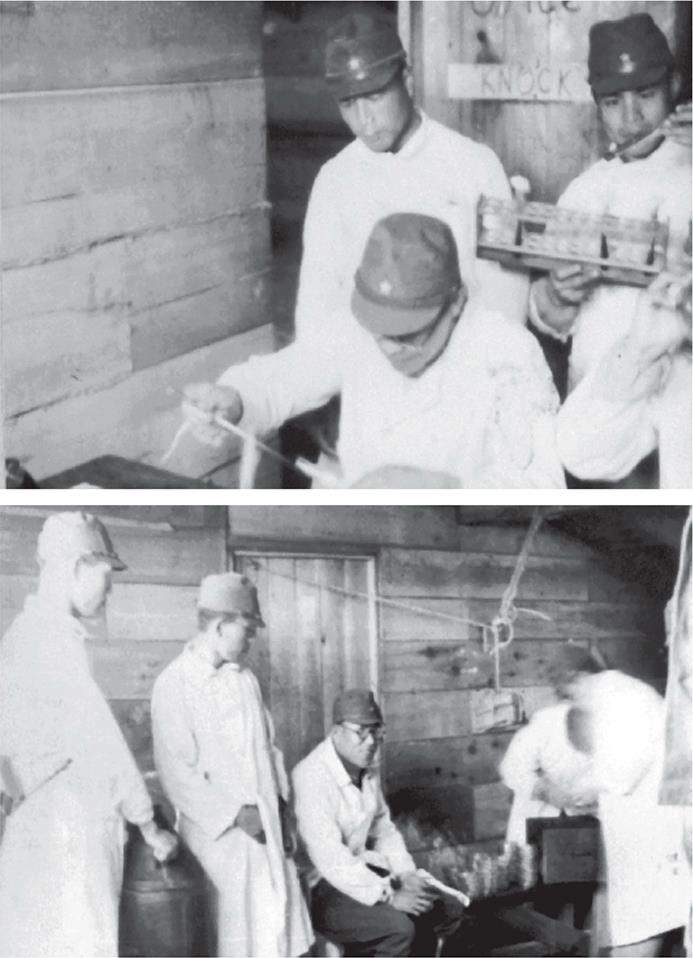 · 在战俘营所长及其部下的带领下,笔者(指永山太郎军医大佐,译者注)与户村队长一同视察了诊疗所的情况。本队的桑岛军医中尉、大气军医少尉和小林军医少佐也一同前往。出于研究目的先行到达的人们也参加了此次视察。