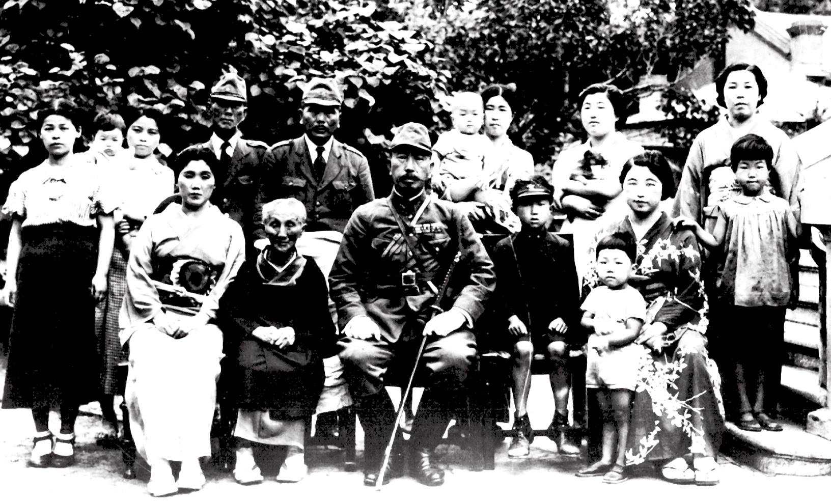 1945年3月东京大空袭后,石井全家迁到了哈尔滨。图为石井一家在哈尔滨吉林街石井家的院子里合影。前排左三为石井四郎