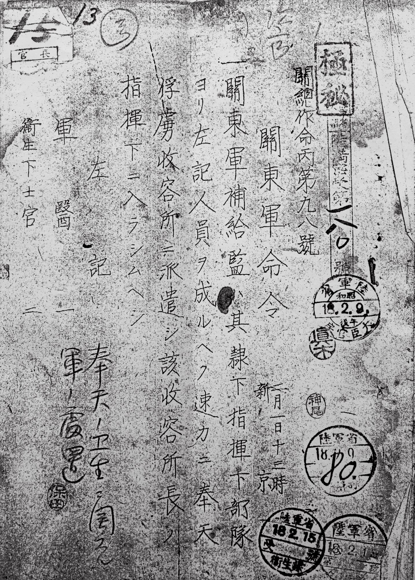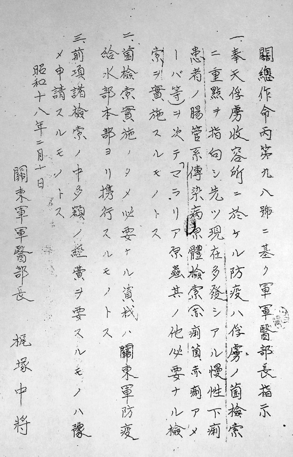 隆二中将的命令书(关东军总司令部作战命令丙九八号),时间是1943年2月1日。根据这一命令,梶塚军医部长向关东军防疫给水部本部(731部队)下达了指示书,由731部队派遣30名人员携带器材到奉天盟军战俘营,进行慢性痢疾患者的“菌检索”。