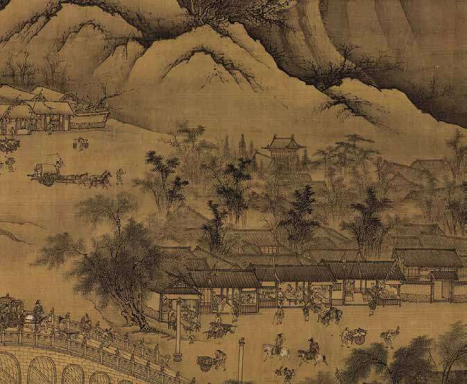 在行旅题材的古画中,画家们可能不忍心让画中的旅人太过辛苦,因此常常画有竖着高高酒旗的饭馆酒肆。
