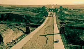 画中几段时隐时现的道路应该就是当年秦始皇所修建的秦驰道。秦始皇统一六国后,为了实现对全国的有效管理,以咸阳为中心,陆续建造了九条驰道(西方道、秦栈道、武关道、东方道、并海道、临晋道、上郡道、北方道和秦直道),形成了全国快速交通网。