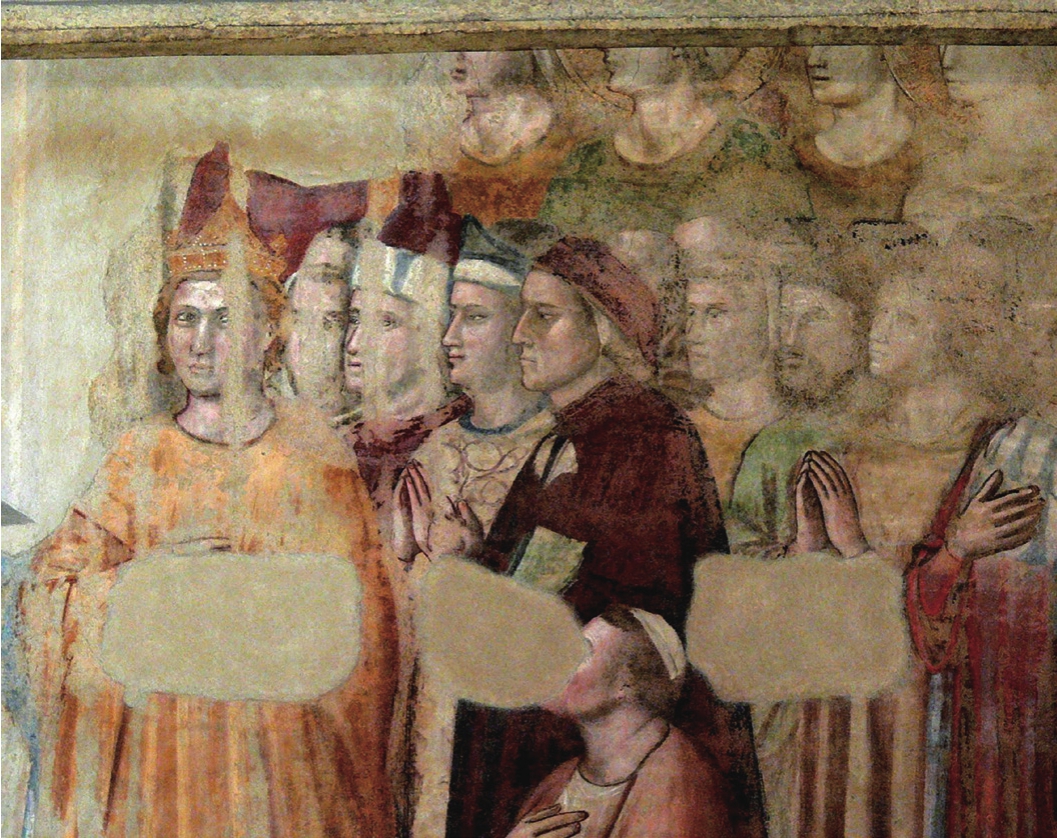 乔托最后的工作地点,是巴杰罗宫(Palazzo del Bargello)的波德斯塔礼拜堂(Cappella del Podestà)。那里残存的壁画描绘了天堂、地狱、施洗者圣约翰和抹大拉的马利亚,天堂人物里有乔托已过世的挚友但丁(图1.12)。