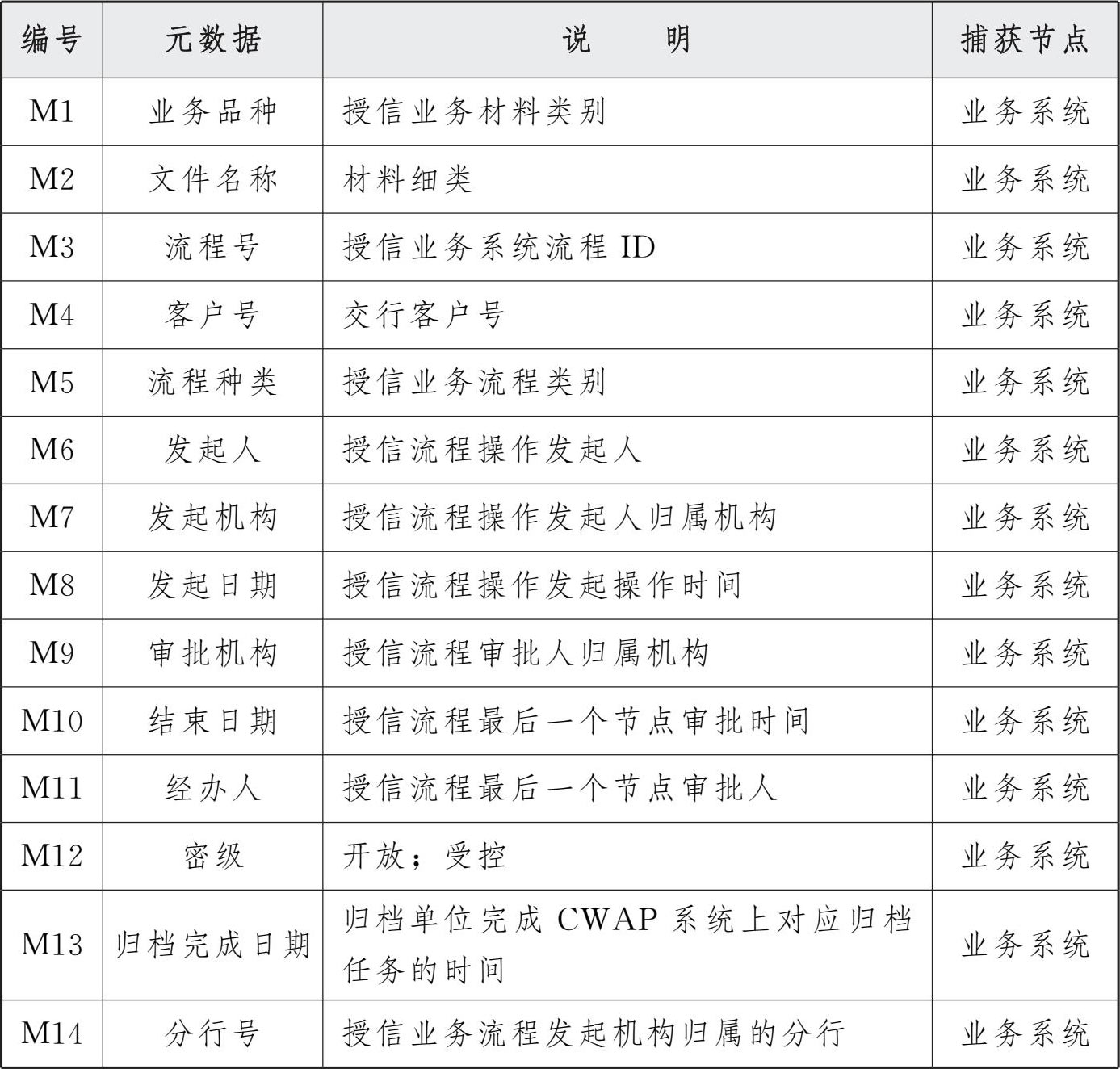 表5 交通银行授信审批系统业务元数据