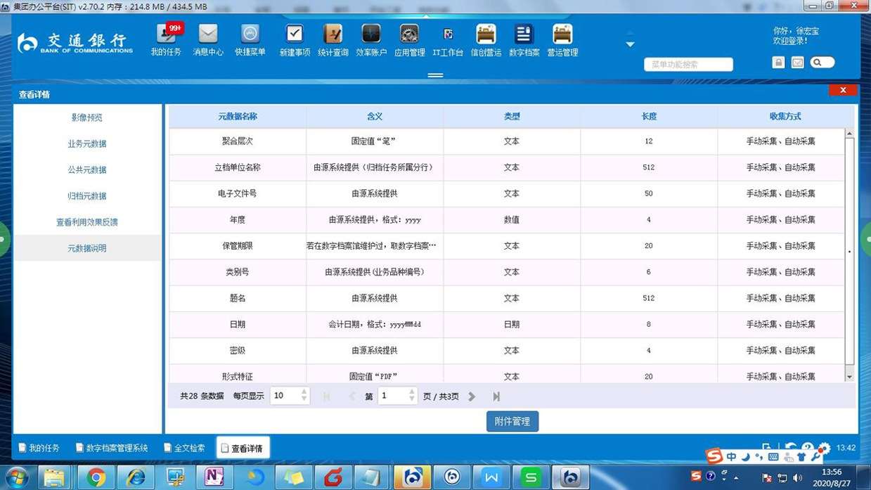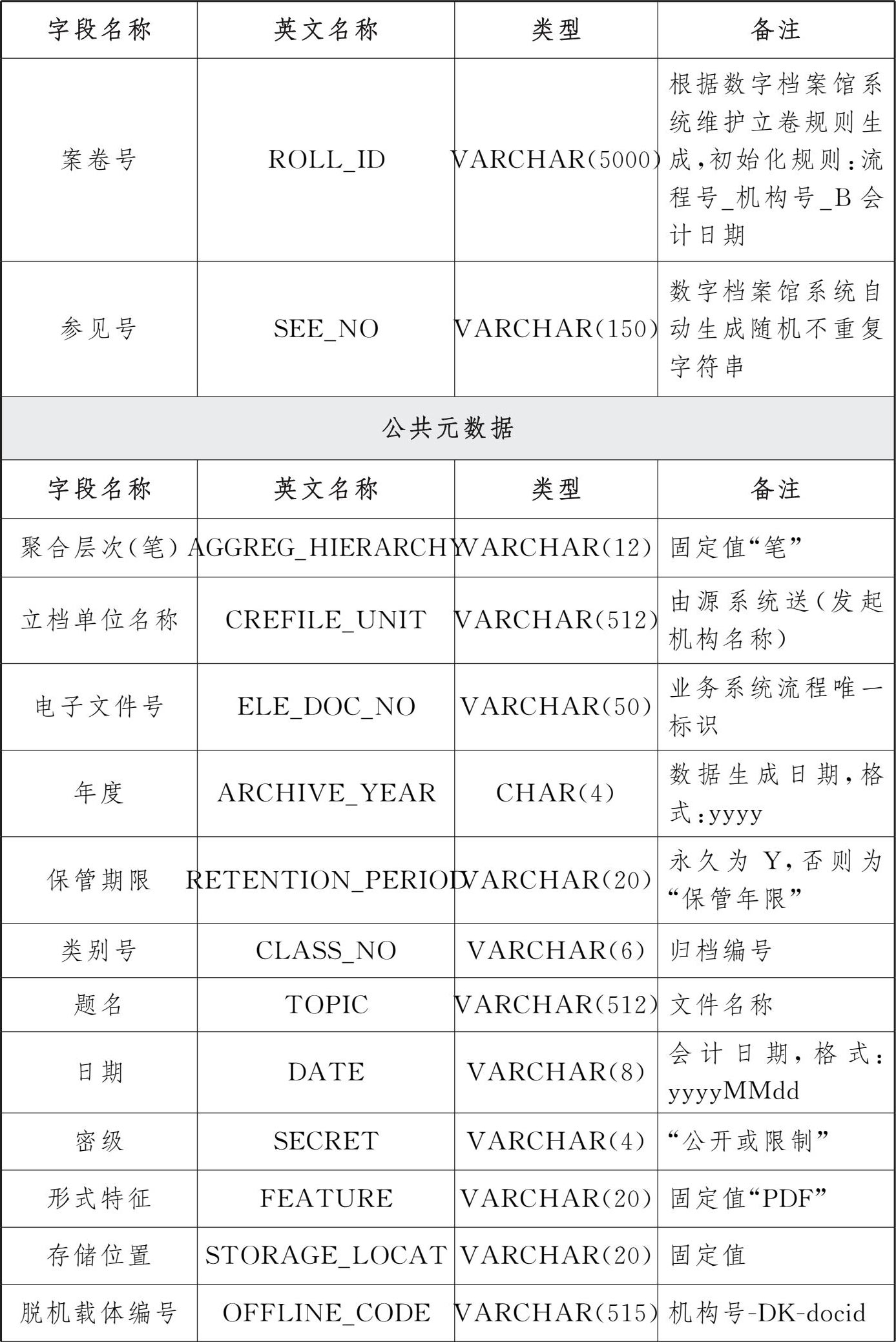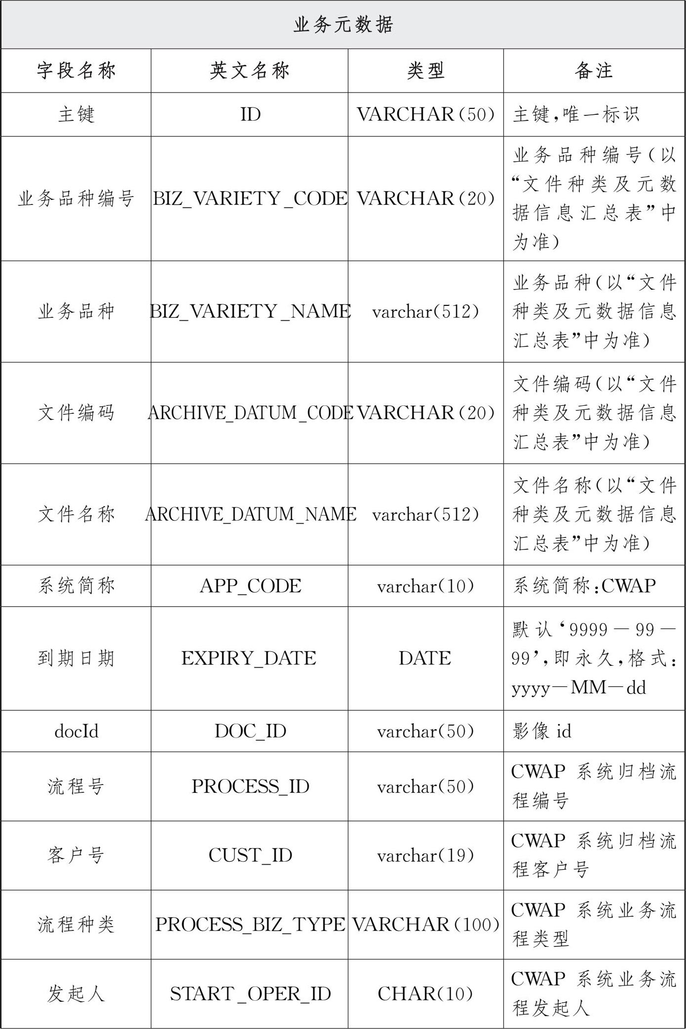 在参考《文书类电子文件元数据方案》(DA/T 46—2009)的基础上,结合目前交通银行电子文件管理实际,形成了《交通银行电子文件归档元数据规范》,将元数据从概念层次上依据具体业务相关性分为公共元数据和业务元数据两个域。公共元数据为业务无关性信息,是电子文件进入数字档案馆(室)的必要条件。业务元数据是业务相关性信息,依据各条线各业务的实际需要,进行专门定义。