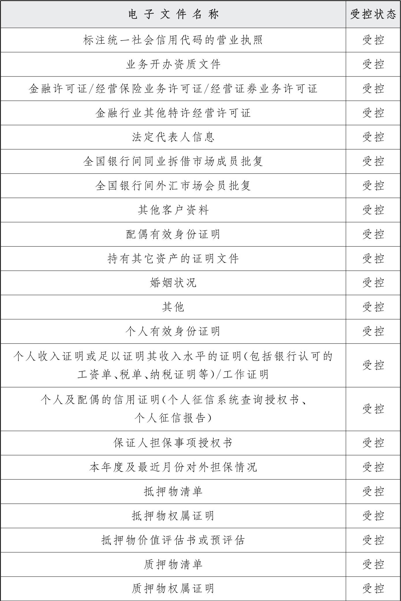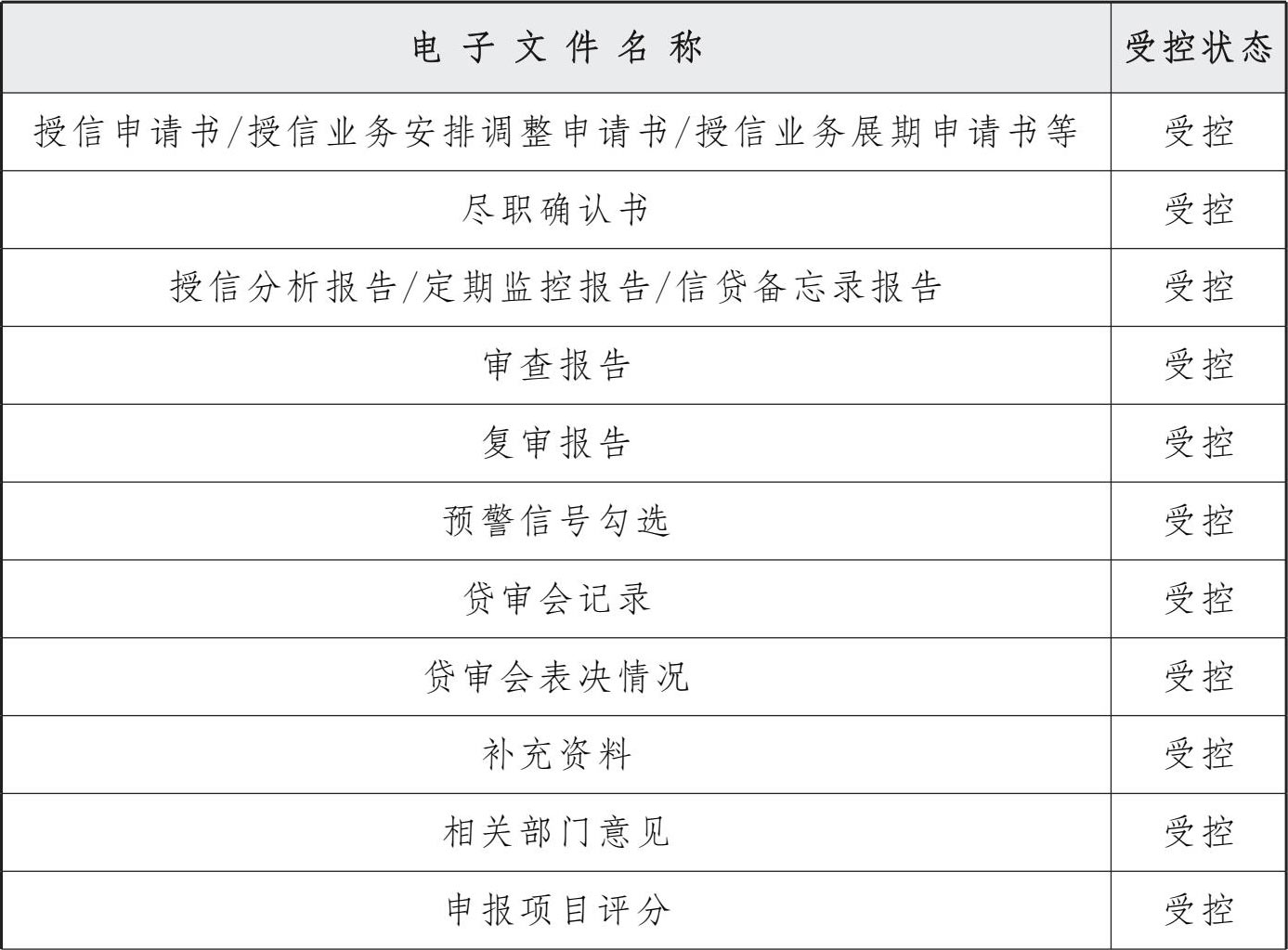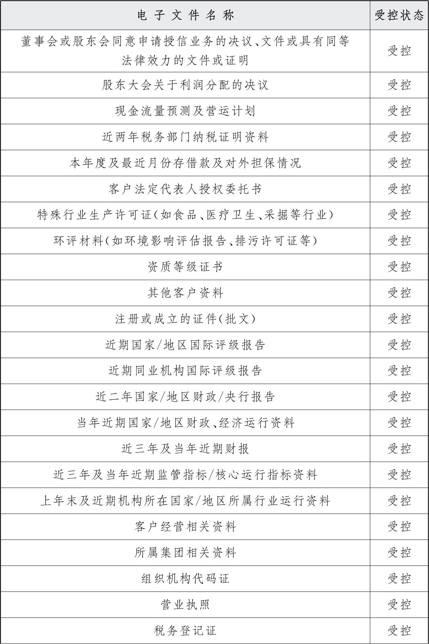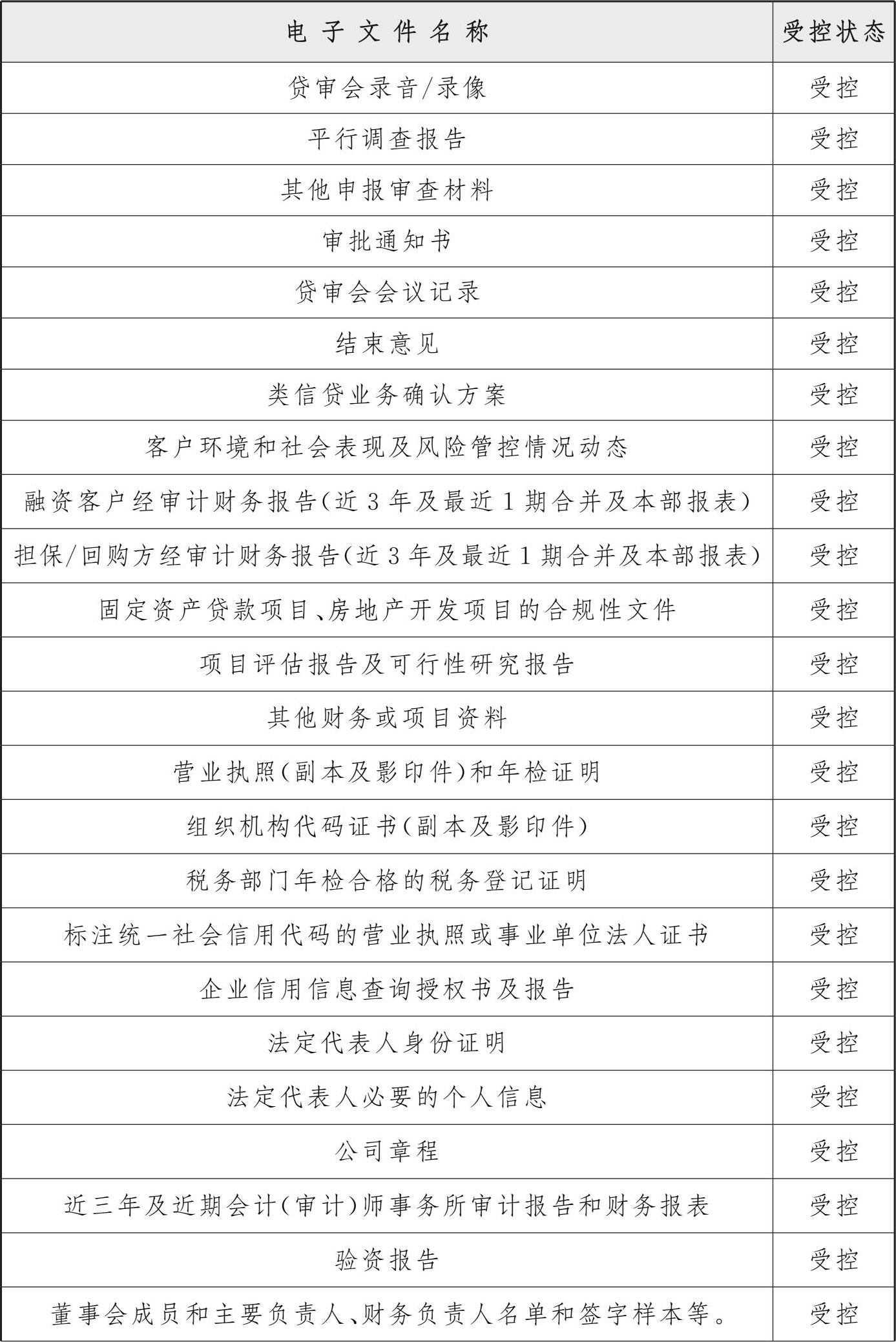 授信无纸化主要是指授信申报、审查、审批资料的无纸化,归档范围涉及以下授信流程中上传或保存的电子文件。