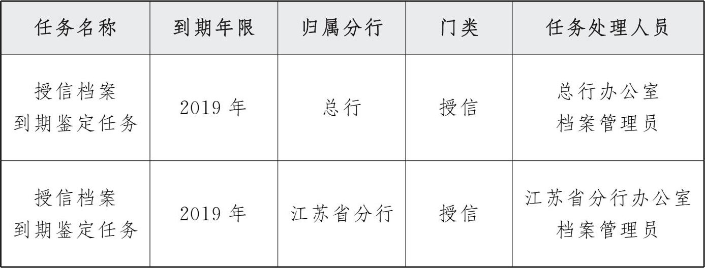 a)系统根据到期年限、归属分行、门类等作为分类条件生成不同的到期鉴定档案清单和任务。