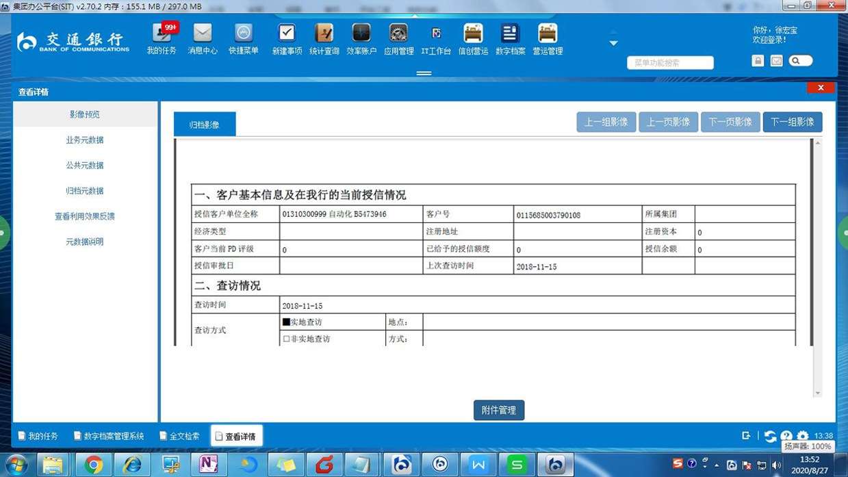 2019年1月份以前原有授信业务都是双套制管理,为推行授信业务处理无纸化,交通银行开发了授信业务审批系统,基本实现授信业务流程无纸化。因此,交通银行对授信审批系统产生的数据只做电子单套制归档。