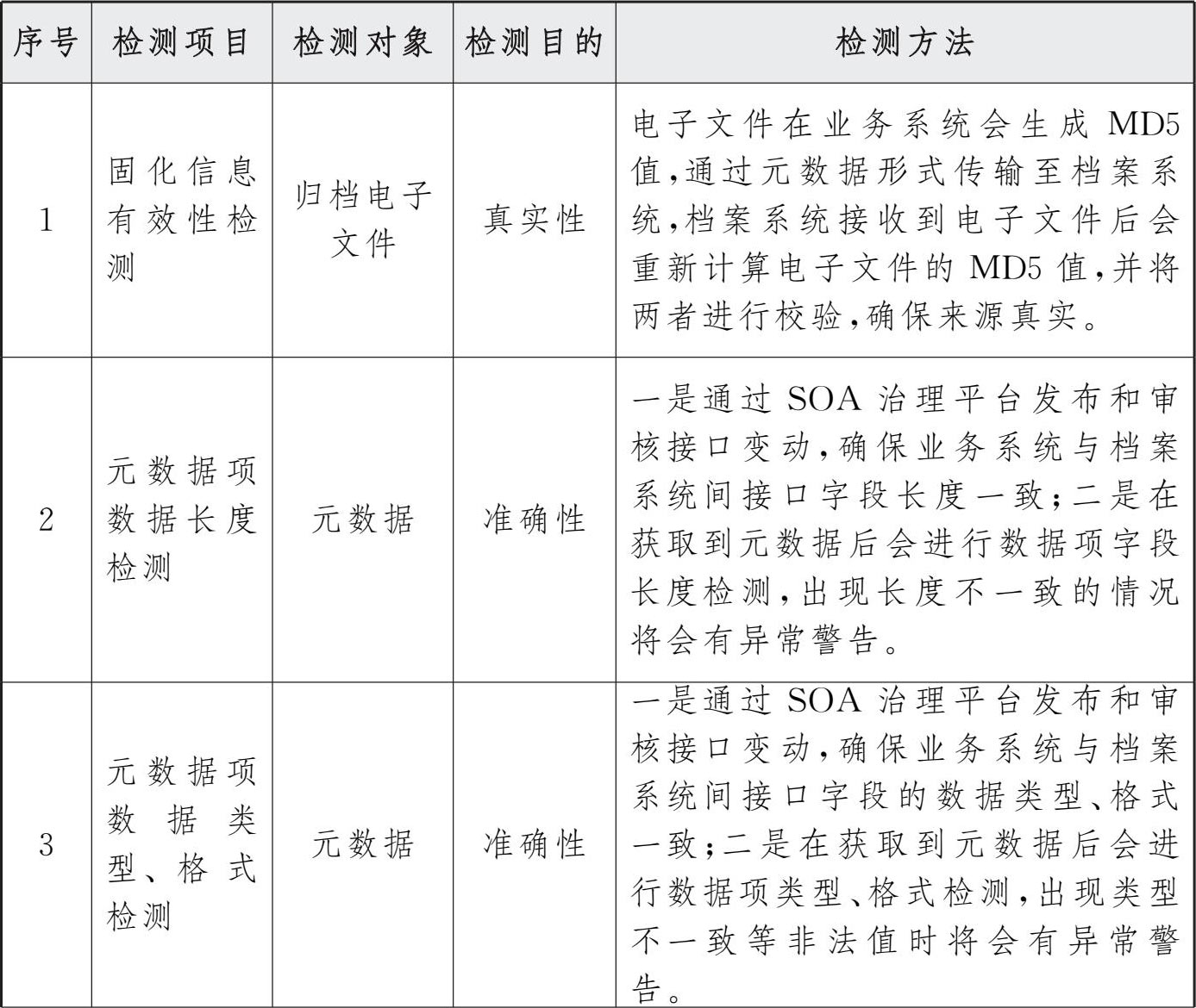 通过系统定期检测和人工抽检的方式,对电子档案进行检测,在电子档案长期保存过程中,针对电子档案所做的任何操作都应记录,进行档案全生命周期管理。在检测时优先检测这部分变化的元数据信息。