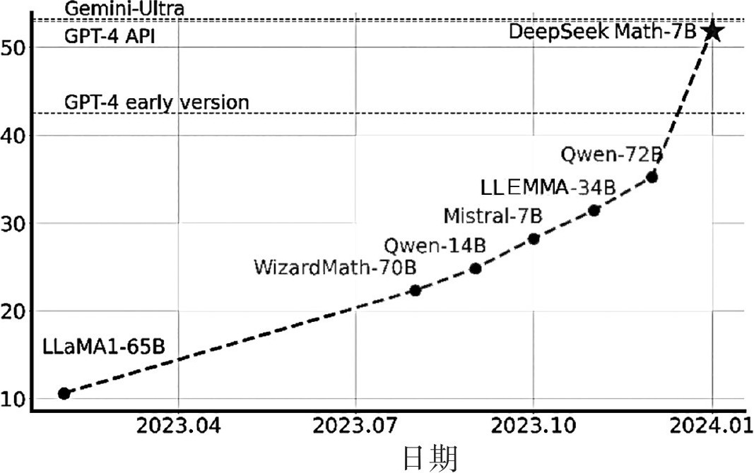 以代码生成(DeepSeek Coder)和数学推理(DeepSeek Math)为突破口,通过开源7B到67B参数的模型快速建立行业口碑。例如,2024年1月开源的7B数学模型在Math基准测试中超过50分,接近GPT-4和Gemini-Ultra的水平(见图1-2),直接挑战了闭源模型的垄断地位。