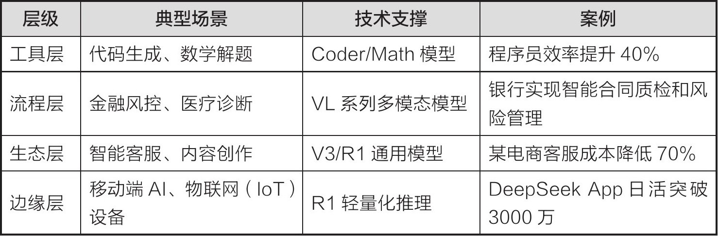 DeepSeek的应用场景从单一技术工具向生态级平台演变,形成了“四层渗透”格局(见表1-4)。