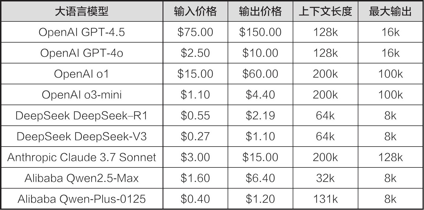 表1-3 市场主流大语言模型的使用价格对比(单位:百万token)
