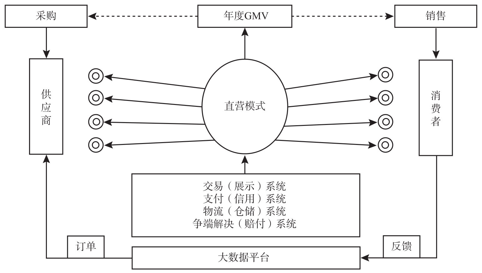 成立之初,京东主要销售3C产品(计算机类、通信类和消费类电子产品)。3C产品具有高标准化的特点,价格容易相互比较。京东抓住用户对3C产品价格敏感的特点,以低于传统销售渠道10%左右的价格,在网络上销售3C产品,并提供质量保证。因此,京东迅速打开市场,初步奠定“正品”“低价”形象,这是直营模式的优势(见图2-2),并且早期渠道、物流投入巨大,一旦建成就具有规模优势,形成了壁垒。