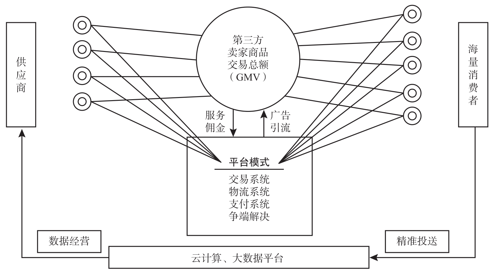 淘宝和天猫直接服务于第三方商家和买家,并收取服务费,是买卖双方的交易平台,在核心电商平台之外,阿里巴巴还搭建了支付体系(支付宝)、数据服务(阿里云)、物流服务(菜鸟网络)等服务平台,为线上交易的各个环节提供服务和技术支持,如图2-1所示。
