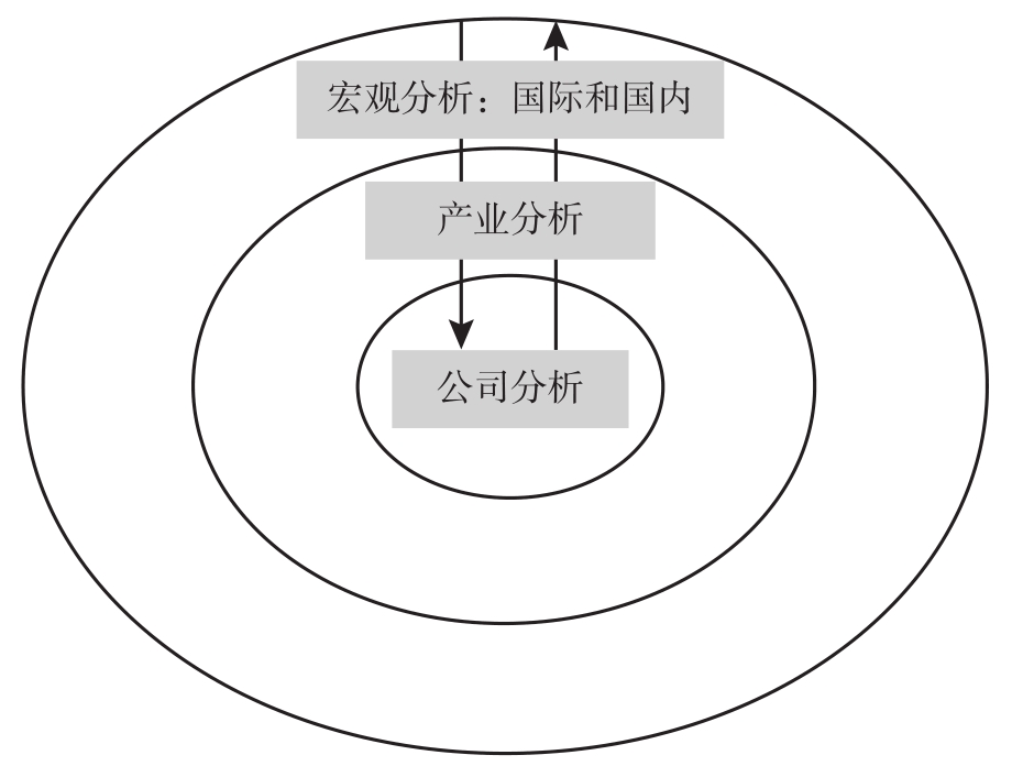行业分析和竞争分析是在宏观经济分析的大背景下进行的。作为一种预测方法,这种预测方法从宏观经济预测到行业预测,再到单个公司和资产预测,被称为自上而下的预测方法。分析师可以从宏观经济活动水平的预测开始,预测整个行业的销售额以及公司在整个行业中的市场份额。还可以将分析师对各个公司的预测汇总为行业预测,最后汇总为宏观经济预测,这样的方法称为自下而上的预测方法。图2-3说明了这两种方法,自下而上的预测方法存在假设不一致的问题。例如,不同的分析师可能假设不同的通货膨胀环境,这可能会影响最终个股估值的可比性。在自上而下的方法中,组织可以确保所有分析师使用相同的通货膨胀假设。