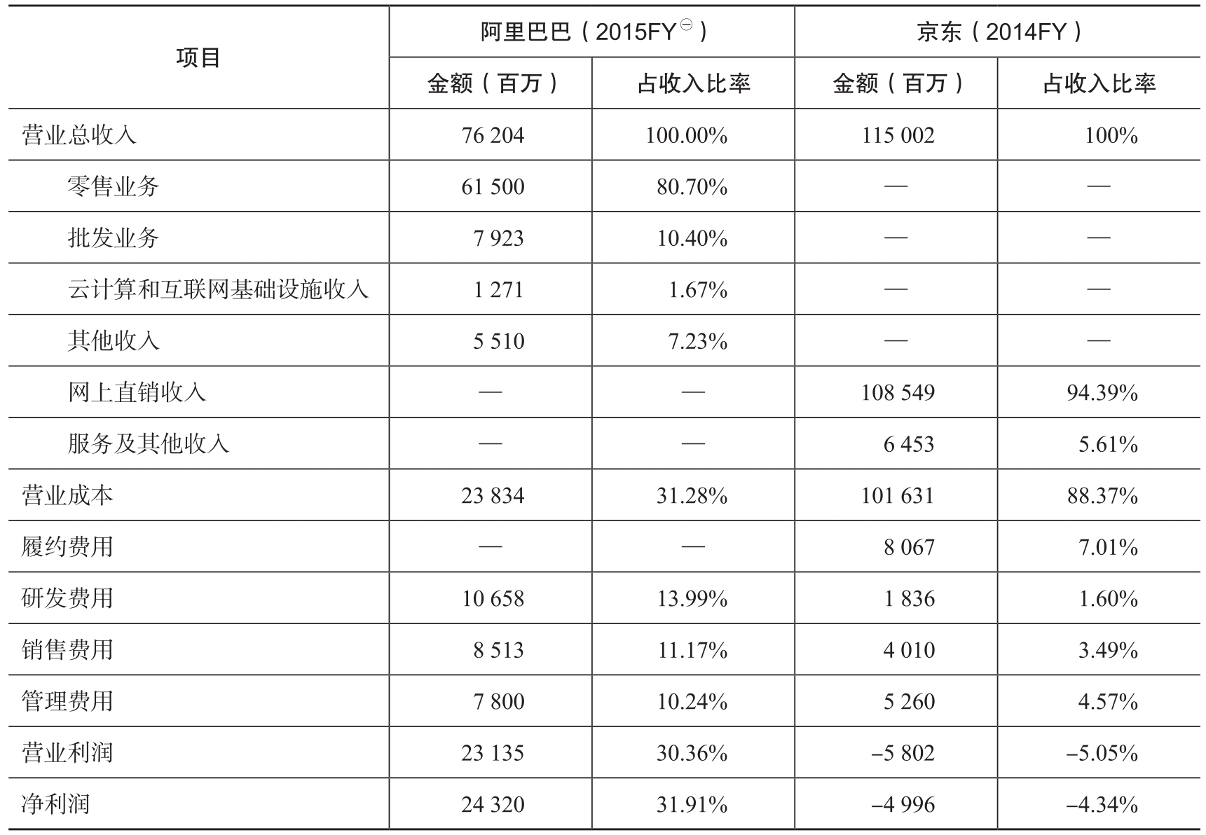 注:阿里巴巴在境外上市,会计年度截止时间是每年的3月31日,因此阿里巴巴2015年的年报反映的时间是2014年4月1日到2015年3月31日,而京东的会计年度截止时间是每年的12月31日。