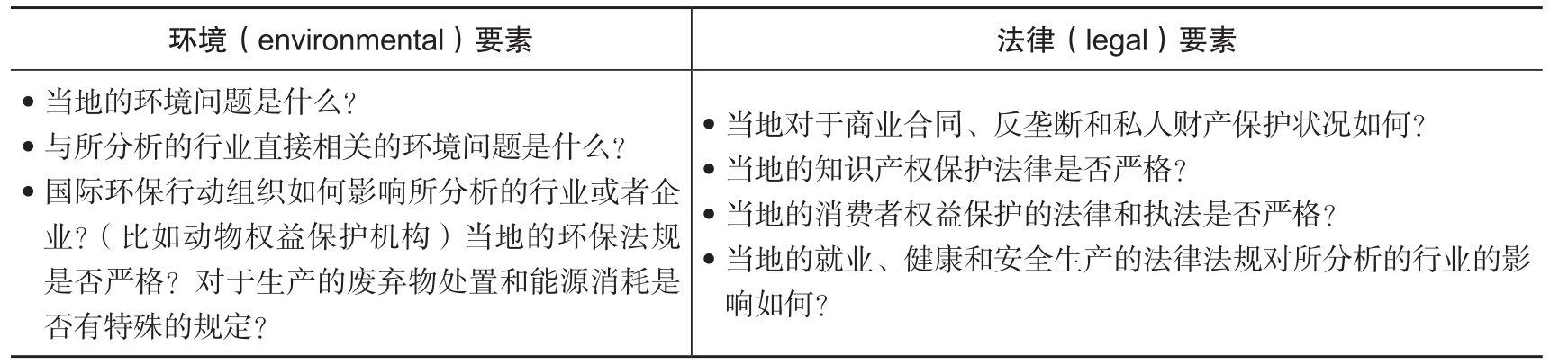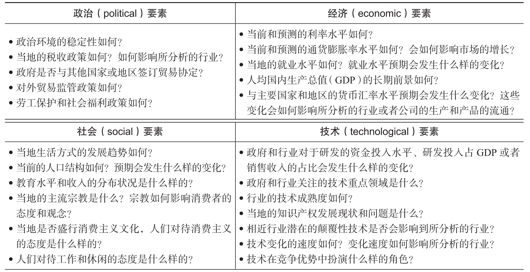 PESTEL模型是一个常用的公司外部经营环境的战略分析模型,由PEST模型演变而来,PEST是政治(political)、经济(economic)、社会(social)和技术(technological)四个要素的英文首字母缩写,之后把法律因素单列,同时环境因素的重要性上升,因此,PEST模型增加了环境(environmental)和法律(legal)两个要素,形成了“PESTEL”模型(见图2-4)。该模型分别从政治、经济、社会、技术、环境和法律六个维度分析公司发展趋势以及公司面临的机会和风险,既是公司风险管理规划的工具,也是管理咨询师开发产品和拓展市场的咨询工具,同时也是财务分析师应用财务分析模型时考虑重要假设因素的分析工具。