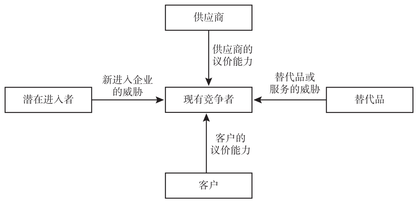 一个行业的利润是客户愿意为该行业的产品或服务付费最高价格的函数。价格的关键决定因素之一是提供相同或相似的产品的供应商之间的竞争程度。根据微观经济理论,如果存在完全竞争的行业,预测价格将等于边际成本,赚取超常利润的机会也很少。相反,如果该行业由单一公司主导,有可能赚取垄断利润。事实上,大多数行业的竞争程度介于完全竞争和垄断之间。行业的竞争可以划分为三种:①行业内现有企业之间的竞争;②新进入企业的威胁;③替代产品或服务的威胁。