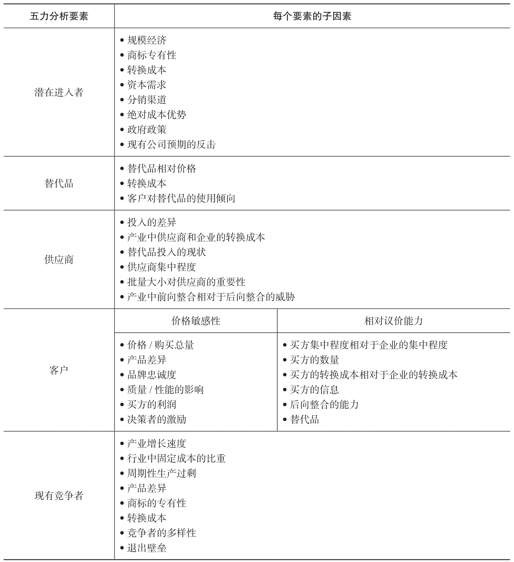 表2-5 五力模型的详细因素分析