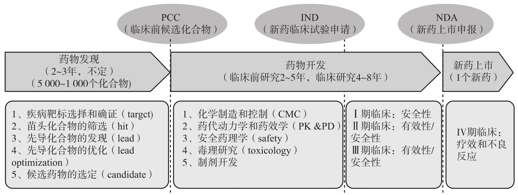 不同行业企业的价值链的重点业务活动存在差异,医药企业研发活动是其基本的业务活动,原研药研发活动的目标是药物发现,药物发现包括苗头化合物的筛选与先导化合物的发现和优化(见图2-7)。新药研发一般分为“药物发现”与“药物开发”两个阶段,后者包括“临床前研究”与“临床研究”。药物发现阶段是新药研发的开始,需要进行科研含量较高的基础研究开发,旨在找到并确定针对疾病或靶点具有活性的先导化合物(Lead Compound)。药物发现过程需要大量的研发投入,平均一款新药需要投入10亿美元的研发费用,花费7到10年的时间来研制一款新药。为了加快研发进程,降低研发成本,医药企业为了让科学家集中精力于药物发现,通常将临床研究外包给专业公司,比如药明康德的主要业务之一就是包括临床试验服务和现场管理服务。在药物获批上市后,生产环节为了加强质量控制,医药企业通常会采用高度自动化的生产。在销售环节,医药企业雇用大量的医药销售代表与医生和医院进行沟通,推广使用新药。在医药流通环节,医药产品需要通过专门的医药流通公司进行药物配送至医院终端,医药产品才能最终送达到患者手中。如果分析师可以获得价值链不同环节的价格信息,则可以判断某一产业内最重要的价值增值环节,比如通过分析医药企业收购某些有前景的新药研发初创公司的收购价格,可以判断药物发现环节在医药价值链中的价值。临床研究公司向医药公司收取的临床研究费用则可以代表临床研究在整个医药开发价值链中的增值。原研药开发为主的医药公司通常把价值链中最有价值的药物发现和需求创造保留在公司内部,而把流通和临床研究环节外包,由此产生了医药合同外包服务(CXO),包括医药合同研发服务(CRO)和医药合同生产服务(CDMO、CMO)。CDMO是指接受医药企业委托从临床前研究开始与医药企业合作,为药品生产涉及的工艺开发、配方开发提供支持,覆盖药学研究指导、药物审批上市及生产环节。而CMO则是指医药企业将药物委托给专业公司进行大规模生产,不涉及研发环节的外包。