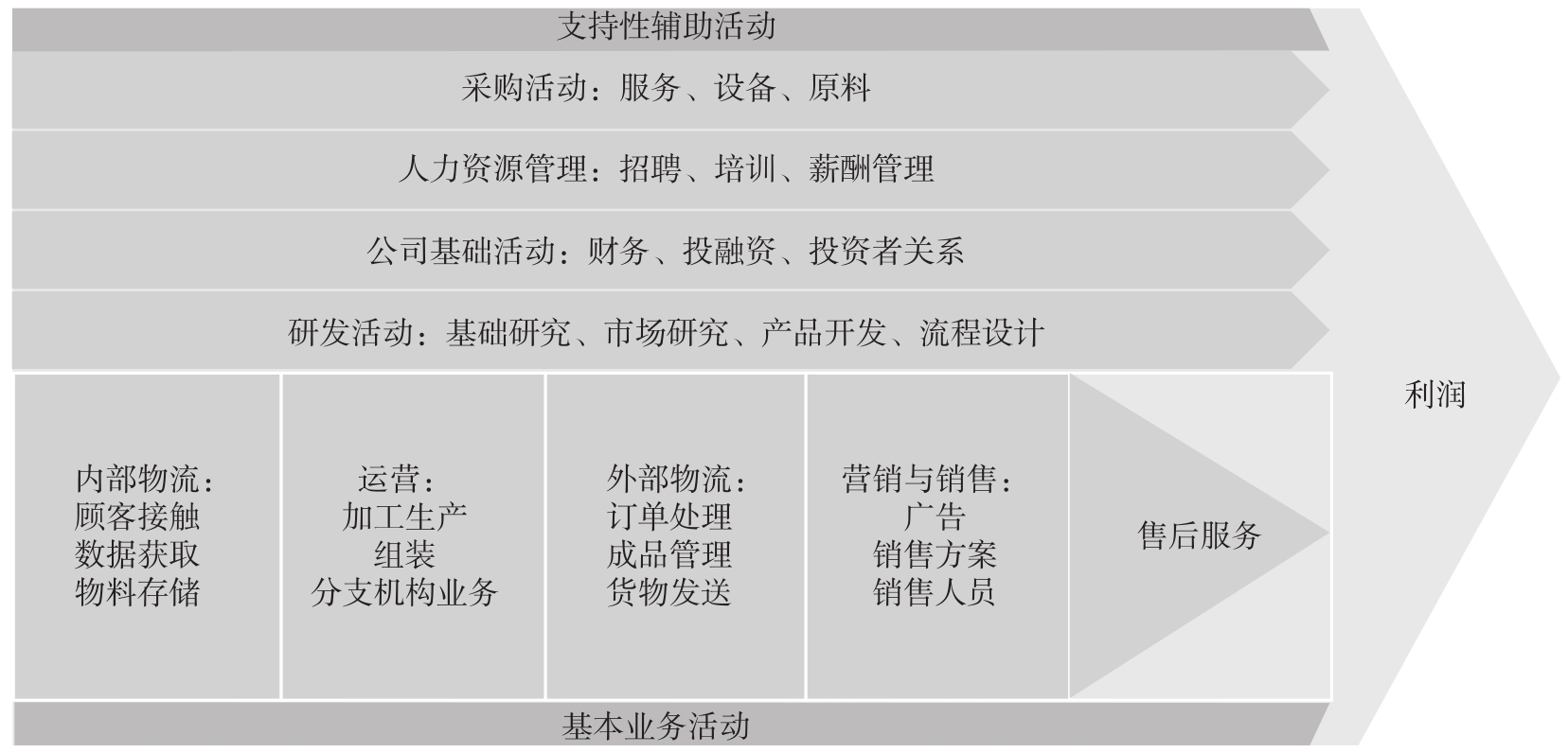 哈佛大学迈克尔·波特在其所著的《竞争优势》一书中指出,每一个企业都是在设计、生产、销售、物流和辅助其产品的过程中进行种种活动的集合体,所有这些活动都可以用一个价值链来表示。价值链包括基本价值活动和辅助价值活动,不同业务的内在联系及企业从事这些活动的最终目的都是为了创造价值。价值链分析是指把一个公司的相关活动进行分解,关注那些能给公司带来竞争优势的业务活动。价值链包括一系列参与企业产品或者服务的创造、生产、流通以及支持性辅助活动,比如人力资源、财务、内外部物流等,如图2-6所示。