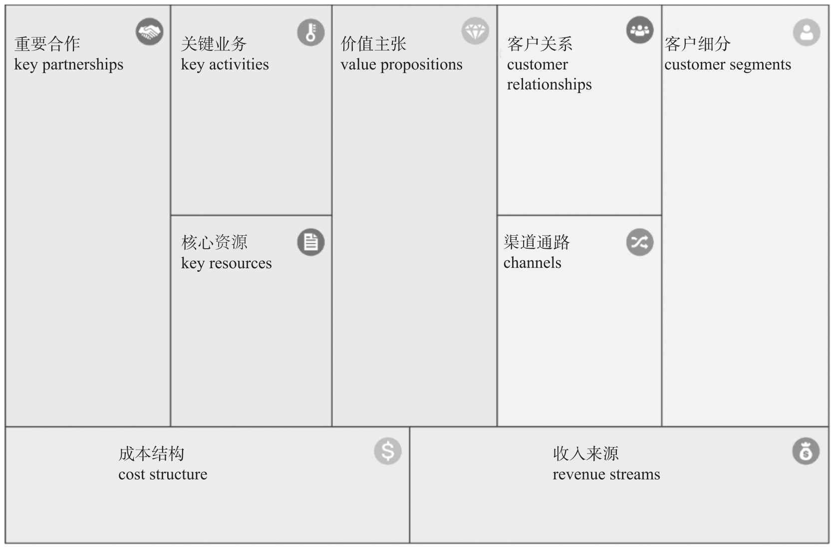 由Osterwalder提出的九要素商业模式画布理论是企业进行商业模式构建和分析的重要工具,九要素画布把商业模式分析变得可操作化,可以勾勒出企业是如何创造价值、传递价值和获取价值的。商业模式画布的九要素包括客户细分、价值主张、渠道通路、客户关系、关键业务、核心资源、重要合作、成本结构和收入来源,如图2-8所示。