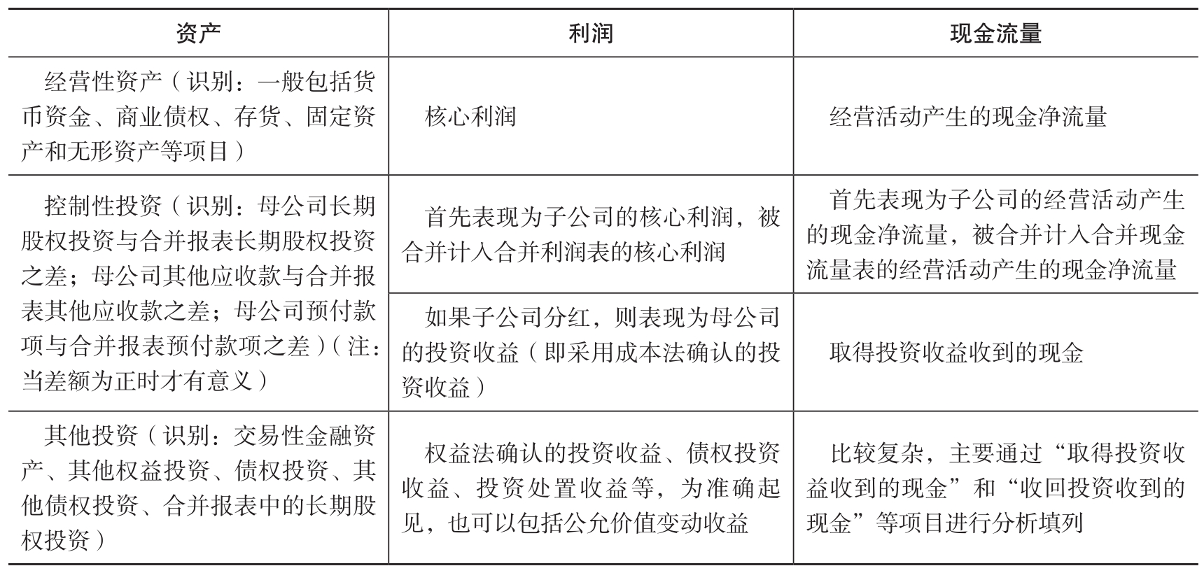 实际上我们还可以对企业的资产做更为细致的划分,把投资性资产进一步分为控制性投资和其他投资,这样企业的总资产就分为经营性资产、控制性投资和其他投资三个部分。其中,经营性资产和控制性投资是分析的重点。