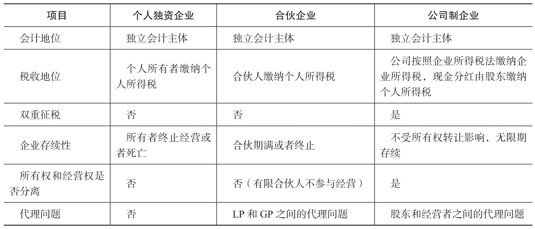 公司制是人类历史上一项伟大的制度发明。公司由职业经理人经营管理,股东以投资额为限、公司以全部财产对外承担有限责任,降低了经营失败对股东个人的风险,可以动员更多的社会资金进行投资,促进社会经济的发展。公司制的有效运行离不开对财产权利的有效保护和具有流动性的资本市场(Thomas A.King,2012),正是由于公司制企业的有限责任特点,为了保护债权人和社会公众,大部分国家都对公司制企业的设立、运行和清算进行比较严格的监管。不同法律组织形式差异对比如表1-2所示。