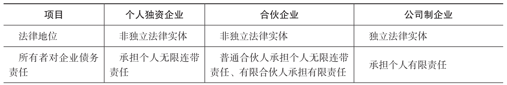 不同的企业具有不同的法律组织形式,不同的法律组织形式会影响企业所有者之间、所有者与债权人、所有者与管理者之间的关系,从而产生对会计信息的不同需求。根据我国相关法律,现行企业的法律组织形式包括个人独资企业、合伙企业和公司制企业三种。