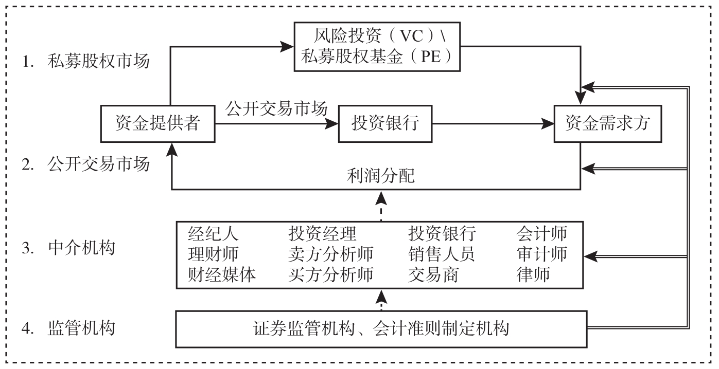 资本市场是连接拥有资金的投资者和需要资金的企业之间的桥梁,是由投资者(资金提供者)、筹资者(资金需求方)、监管机构、中介机构共同组成的有机整体,包括私募股权市场和公开交易市场(见图1-2)。公司制实现了所有权和经营权的分离,企业管理者作为股东的代理人对企业日常进行经营管理,投资者和企业之间存在着信息不对称问题,需要金融中介机构(证券公司、商业银行、共同基金等)汇集个人投资者的资金,分析和选择投资机会,进行投资决策。相对于个人投资者,机构投资者拥有更多的资源和更高的能力对被投资企业进行监督,而公开透明的信息披露是监督的基础。
