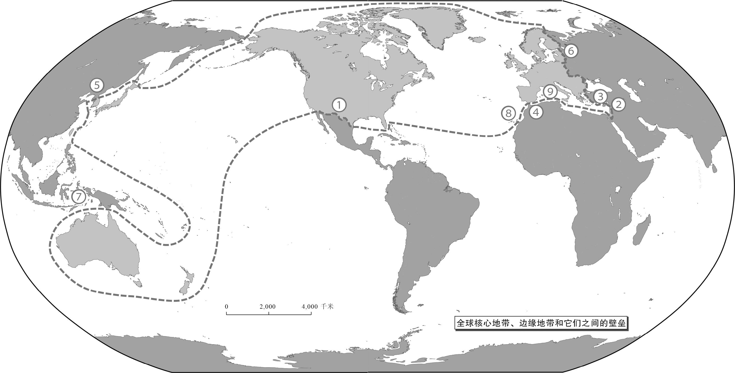 图1.1 一分为二的世界:21世纪初的全球核心地带和边缘地带示意图,图中被虚线围起来的部分是全球核心地带,虚线以外的是全球边缘地带。图中那些用数字标记的国家和地区的政府都试图阻止非法移民从边缘地带涌向核心地带