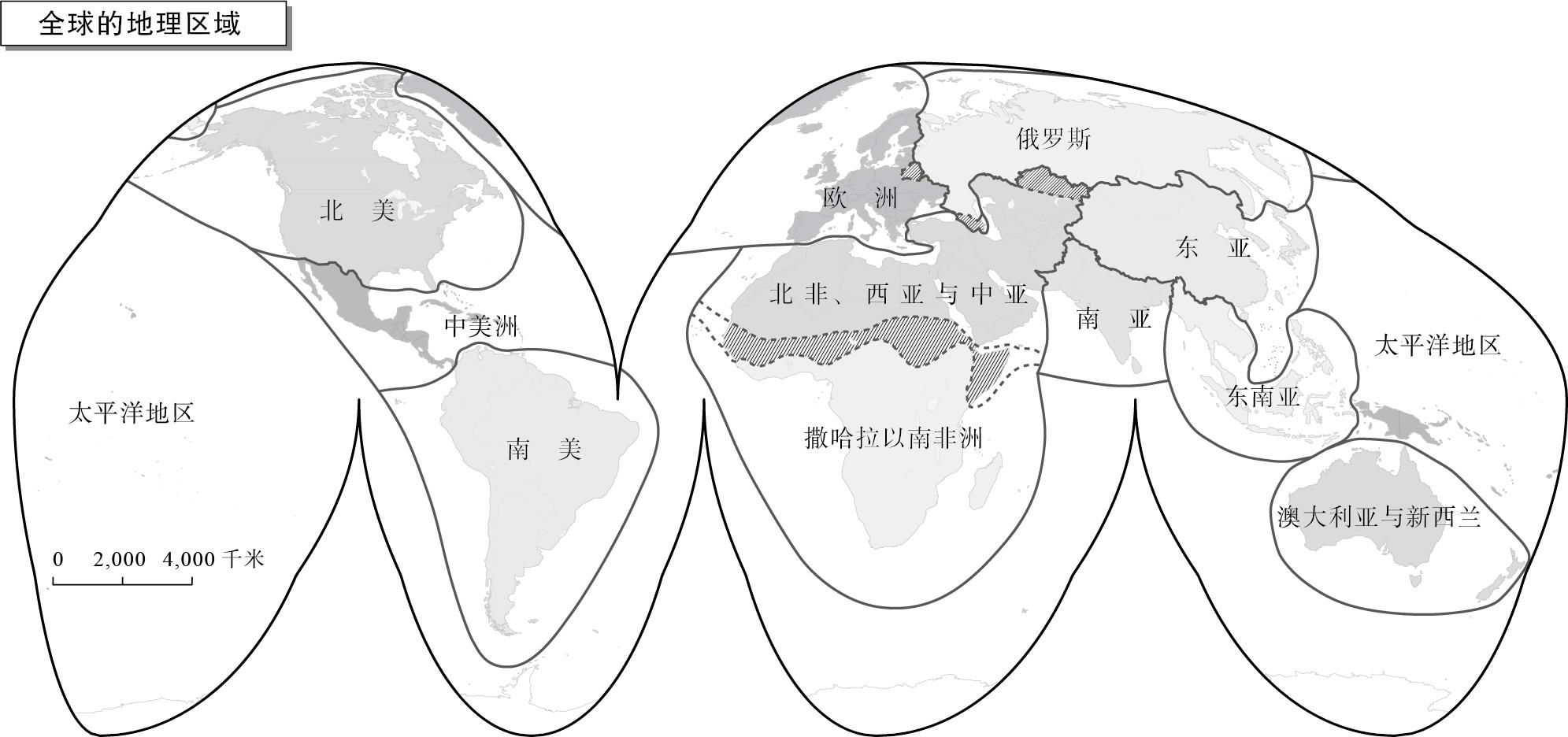 图1.4 本图反映了一种结合自然、文化、政治和经济等因素来综合考察全球地理环境的方法。由于图片尺寸的限制,本图只对几个主要的过渡区(比如非洲、中亚和东欧)进行了标识,而并未清晰地划分其他区域的边界