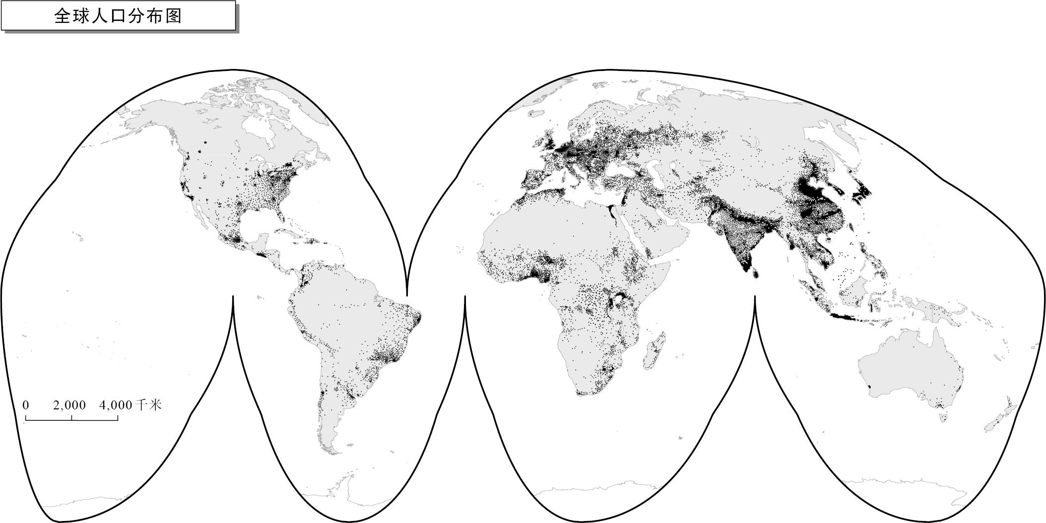 图1.2 全球人口分布图,图中一个小黑点代表10万人。本图反映了“世界岛”(欧亚大陆和非洲)以农耕为基础的古老的人口定居模式,这种分布模式一直延续至今