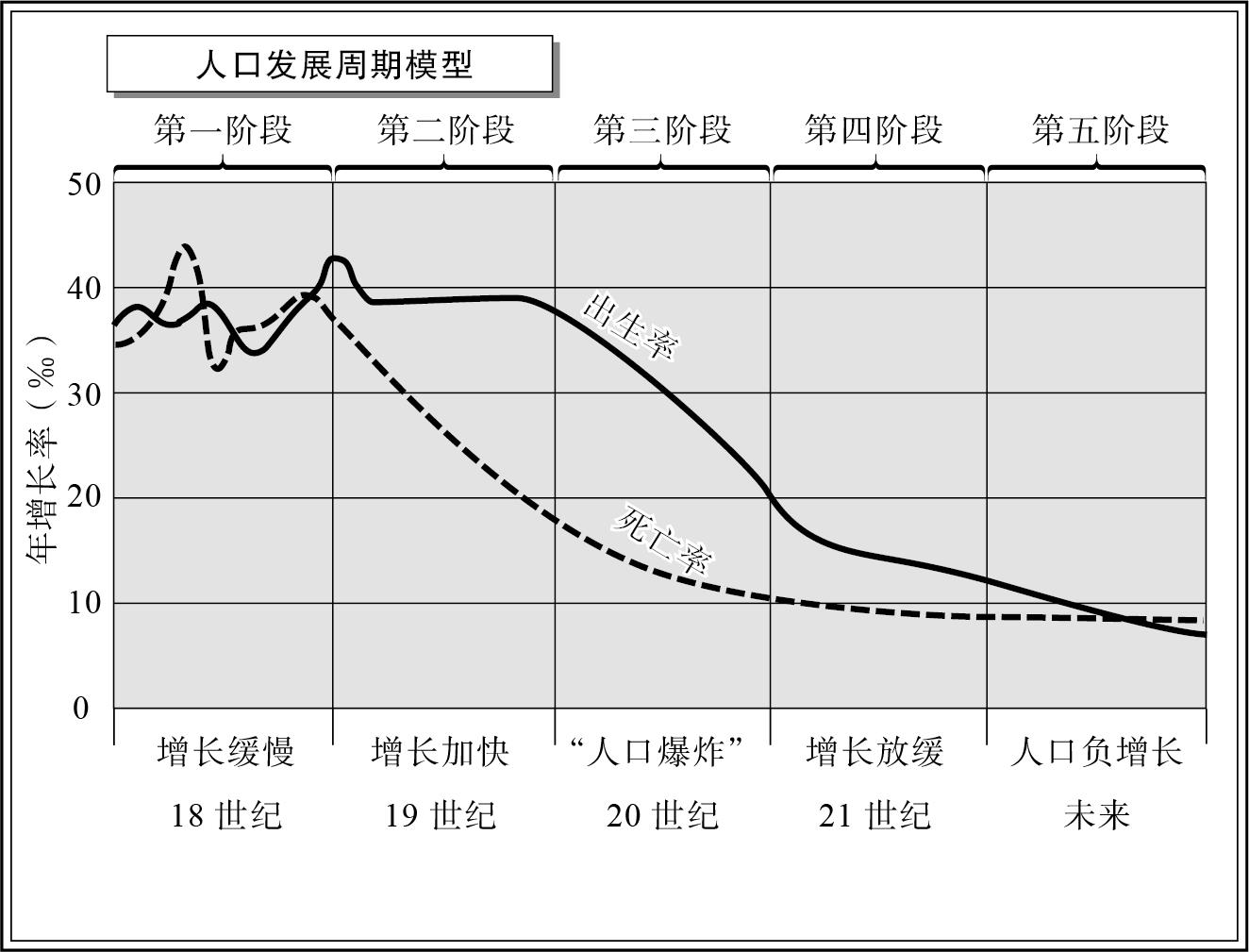 图1.3 20世纪的“人口爆炸”主要有两个原因,一是死亡率快速下降,二是出生率居高不下。一些国家仍处在人口发展周期的第三阶段;还有一些国家则已经进入第五阶段,其人口数量趋于稳定或者开始下降。目前,全球人口的整体自然增长处于第四阶段