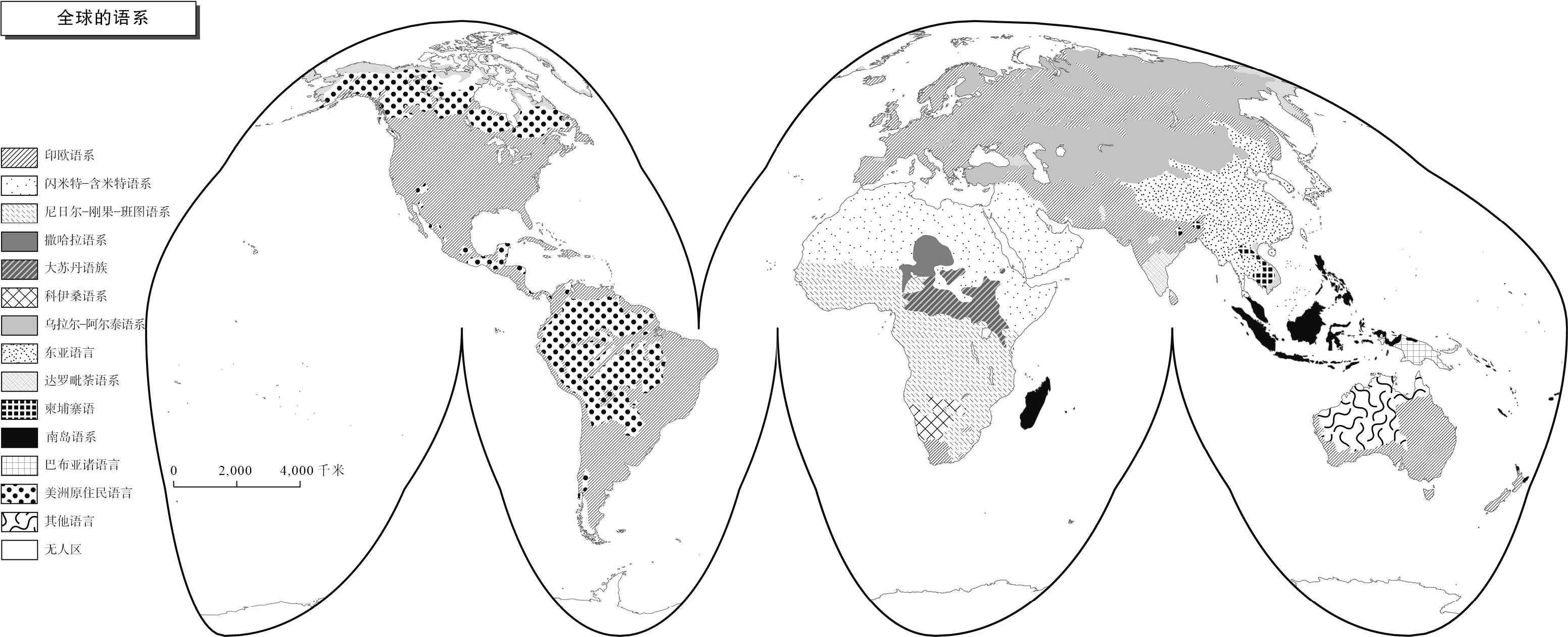 当语言学家们努力重新绘制一幅本土语言谱系图时,真实世界中的残酷现实却与理论构想并不一致。在英语、法语和西班牙语等殖民语言的排挤下,北美的本土语言不断退缩,只在零星的保留地上有所残存;只有在南美洲的安第斯山区和亚马孙河流域以及中美洲的一些面积较小的地区,大量的美洲原住民语言区保留了下来(图2.2)。在澳大利亚和新西兰,英语使用者的人数已经超过了原住民语言和毛利语使用者的人数。南非已经成为一个“双语”国家,但这里的“双语”并不是指在该国拥有最多使用者的两种语言,而是两种代表权力的语言:南非语和英语。当去殖民化浪潮席卷全球时,亚洲和非洲的许多国家先后摆脱了殖民统治,并宣布将英语、法语、西班牙语或葡萄牙语作为他们的“官方”语言,有些国家则把英语和某种当地语言同时当作官方语言。例如,印度的官方语言是英语和印地语,文莱的官方语言是英语和马来语,吉布提同时使用法语和阿拉伯语,中非共和国的官方语言是法语和桑戈语。但也有一些国家至今只承认一种官方语言,比如安哥拉的官方语言是葡萄牙语,塞内加尔的官方语言是法语,尼日利亚的官方语言是英语,赤道几内亚的官方语言是西班牙语。