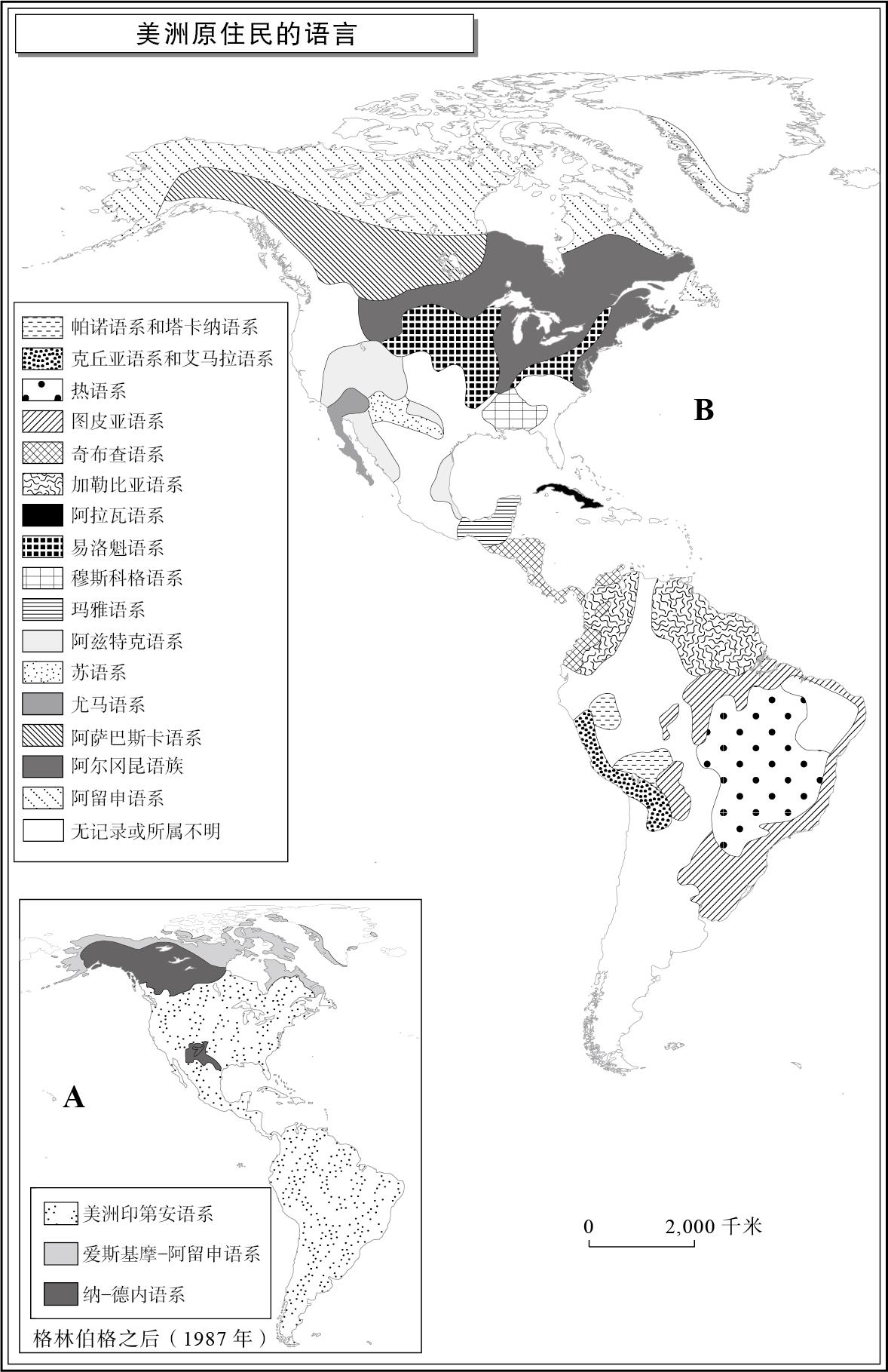 图2.2 本图展示了对美洲原住民语言加以归类的两种方法。约瑟夫·格林伯格把美洲原住民语言分为3个主要语系(如图A所示);另一些学者则将其分为16个甚至更多语系(如图B所示)。很显然,学者们仍未在这个问题上达成一致。图B是在对不同的资料来源进行汇总和修订的基础上绘制的,这些资料就包括J. Diamond and P. Bellwood, “Farmers and Their Languages: The First Expansions,” Science 300 (2003), p. 600