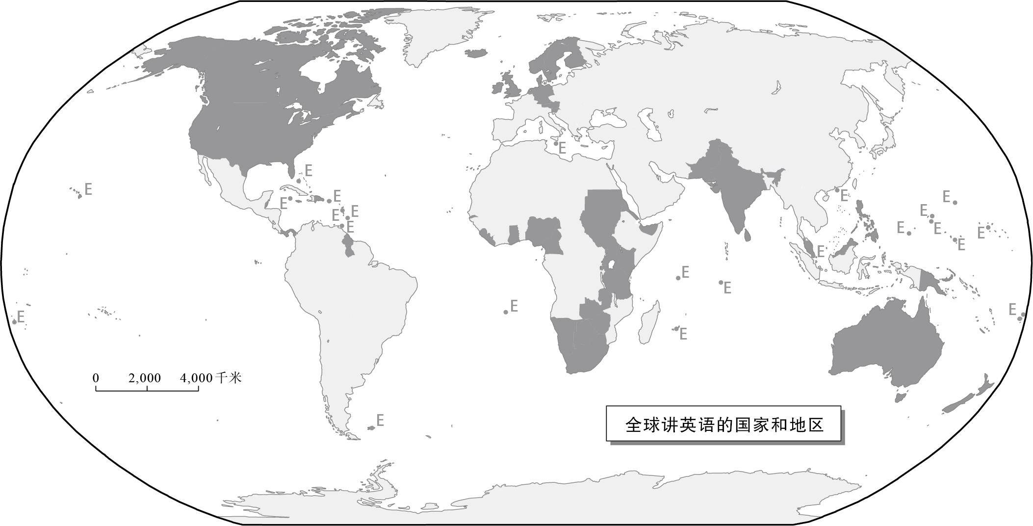 图2.3 在以深色标注或以大写字母E标注的国家和地区,英语具有以下一种或多种作用:作为民族语言或官方语言;作为当地50%以上的人能够熟练使用的语言;作为多元社会中的政府、高等教育和商业领域的 通用语 ;作为前殖民时期的留存语言。本图根据不同的数据来源绘制而成,包括R. G. Gordon, Jr. (ed.), Ethnologue: Languages of the World (Dallas: SIL International, 2007), Book of the Year 2007 (Chicago: Encyclopaedia Britannica 2007), and Graddol (2004)