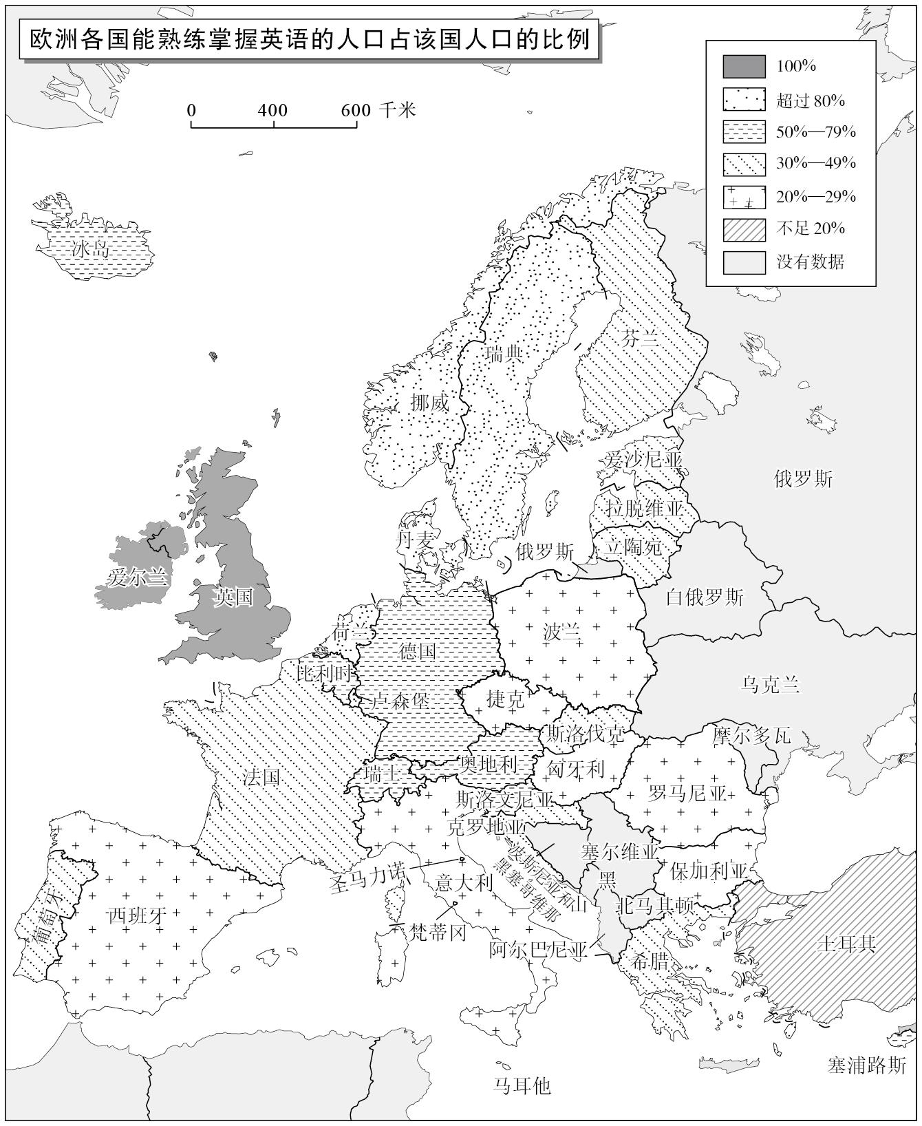图2.4 本图反映的是欧洲各国能熟练掌握英语的人口在该国总人口中所占的比例。在荷兰、丹麦和瑞典,绝大多数人都能说英语。在某几个国家,有超过半数的人能够说英语。本图的数据来自欧盟委员会的欧洲民意调查表特243号(Special Eurobarometer 243)中的“欧洲人及其语言”部分(Brussels, 2006)以及维基百科。瑞士、挪威和冰岛的数据是估算值。此外,少数几个东欧国家没有这方面的详细数据