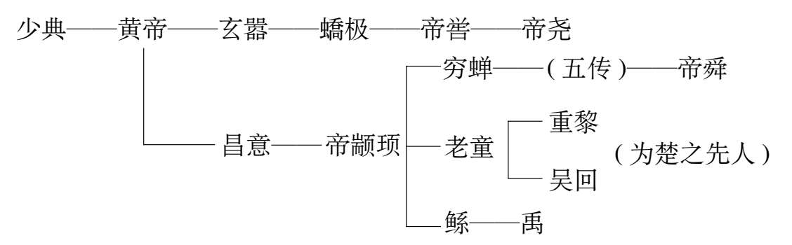 王国维同意皇甫谧此说,并举甲骨卜辞为证,认为“郭璞以帝俊为帝舜,不如皇甫以夋为帝喾名之当矣” [45] 。郭沫若肯定王国维说“倍有见地”,又指出《山海经》“盖以舜、俊、喾为三人也,……凡神话传说之性质,一人每化为数人,一事每化为数事,此乃常见之事实,殊不足怪”,“《山海经》之帝俊实即天帝,日月均为其子息。……实如希腊神话中之至上神‘瑳宇司’,并非人王也”。 [46] 诸家之说,层层深入,皆有依据,其中以郭沫若说帝俊即“天帝”,最为宏观而近是。皇甫、王、郭三家,以为帝俊即帝喾,有甲骨卜辞为证,可信度很高。亦可以推测,这是商代时殷人的观念,殷人试图把帝俊(喾)作为统领天下的天帝,合乎情理。但到了周代,则没有完全认同这一观念。虽然亦以姜原为“帝喾元妃”,顺从了殷人的观念,还用“禘喾”的祭法与殷人保持一致 [47] ,但又说周祖后稷乃姜原直接与天神所生,编造出她践巨人迹,“身动如孕” [48] 的神话, [49] 与天帝攀上直接关系。再者,周人每以“夏”自称,似乎是夏之后人。 [50] 这样做的目的,应当是在表示与殷商有别。周人对于殷商传统的态度游移不定,表明周人对于殷商传统既有保持一致的倾向,又有别出蹊径,直接攀附于天帝并且和夏的传统挂钩的意向,但总的趋势是强调周人自己固有的传统,彰显周人自己的传统。周人编排的古史系统,极大地提高了黄帝的地位,应当与夏人“禘黄帝” [51] 有关。把他与帝俊的位置颠倒过来,说帝俊(喾)是黄帝的后裔。春秋战国时期写成的《尚书·尧典》及《大戴礼记·帝系》等书,总结了周人的古史编排,截断众流,厘定出一个传承有绪的古史系统。这个系统,可以概括为下表: