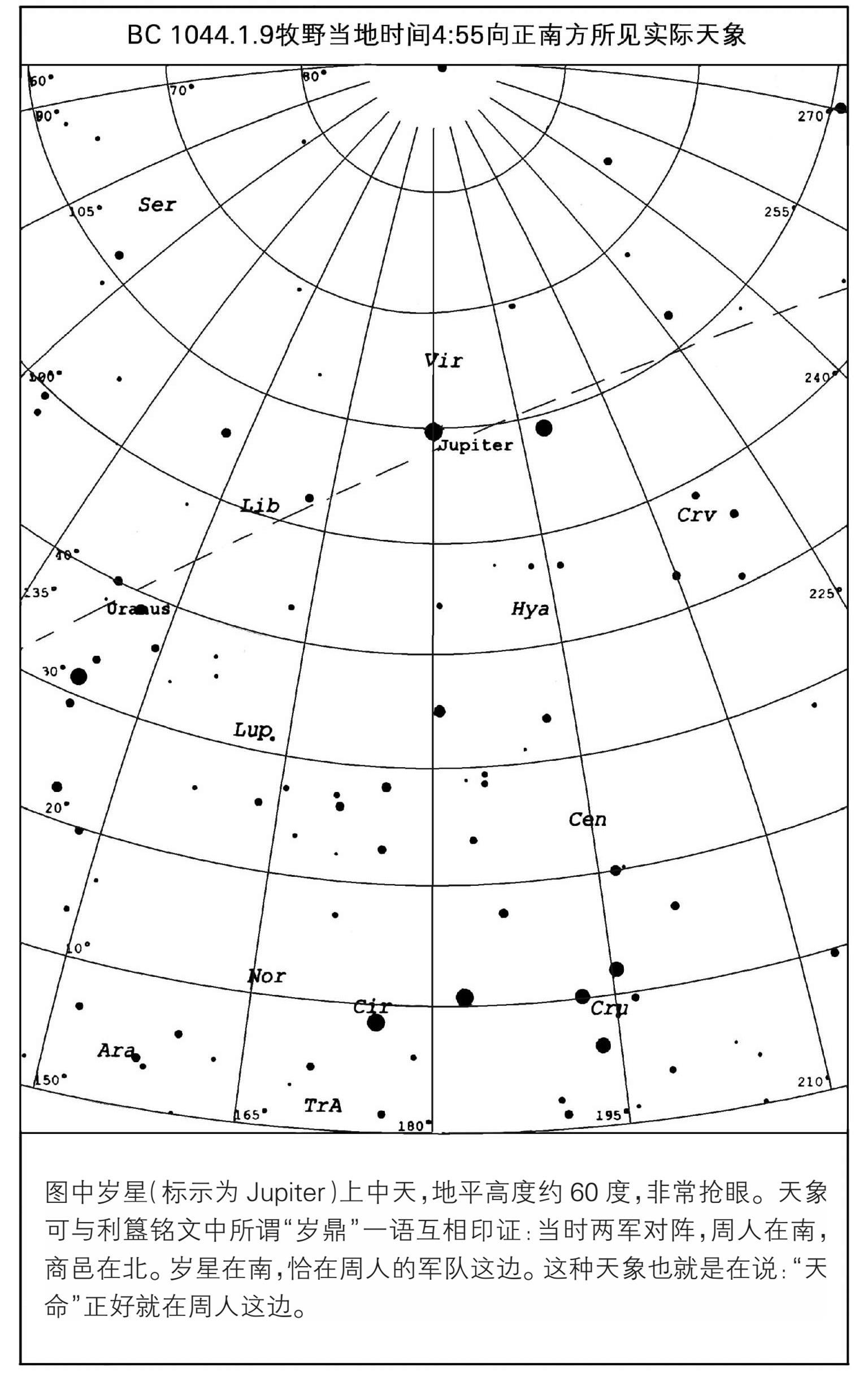 根据江晓原的推算,武王克商之旅始于公元前1045年12月3日 (丁亥) 。那是下着雪的冬天 (《六韬》《吕氏春秋》) 。凌晨,残月挂在房宿“天驷”之上;黎明,太阳从银河在东天的尽头升起;黄昏,辰星 (今称水星) 出现在西北天空(《国语·周语下》“月在天驷”,“日在析木之津”,“星在天鼋〈yuán〉”)。这一天,武王的军队祭祀上天和先祖,誓师要承受天定的“大命” (受命于天) ,去攻取商国。誓师之后,岁星出现在东方 (《淮南子·兵略训》) ,周武王的军队从镐京 (今西安市西南) 出发,在严寒的冬季沿着渭河、黄河南岸向东日夜兼行。经历了时断时续的风雪和一次月缺,周王的军队抵达孟津。稍做休整后,在公元前1044年1月3日 (戊午) ,周人从孟津渡过黄河 (《史记·周本纪》) 。雨雪越下越大,周人却东北而上,逆着风雪开始了向商国王都 (商邑,今河南淇县) 的急行军。商纣王也得知了周武王要自西南方攻来的讯息,在王都商邑附近集结了他所有的兵力。又经历一次月缺之后,公元前1044年1月8日 (癸亥) 的晚上,周国的军队抵达商邑南郊的牧野,和赶来的诸侯在深雪湿滑的莽原会师。武王布阵还没有完成,牧野天上又落下了凄冷的雨。 (《国语·周语下》) 牧野冷雨中的长夜,周人军阵中燃起繁密的火光,仿似满天星斗。经过一个漫漫的长夜,雨和雪都停了,岁星升到正南方 (上中天) ,这对周人来说是无比吉利的天象。 (利簋铭文、《武成》《世俘》) 这是上天用星斗向周人昭示:你们将承受天命,取代商国数百年的政权,拥有中国的土地。