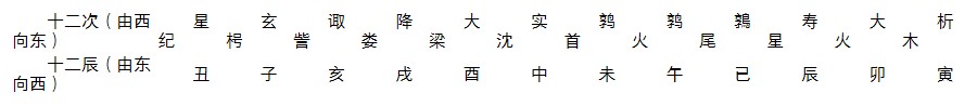 再说太岁纪年法。古人有所谓十二辰的概念,就是把黄道附近一周天的十二等份由东向西配以子丑寅卯等十二支,其安排的方向和顺序正好和十二次相反。二者对照如下表: