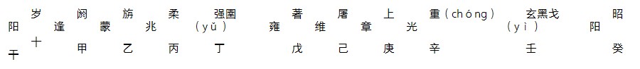 大概在西汉年间,历家又取了阏(yān)逢、旃(zhān)蒙等十个名称,叫做岁阳,依次和上述十二个太岁年名相配 (配法和前述六十甲子相同) ,组合成为六十个年名,以阏逢摄提格为第一年,旃蒙单阏为第二年,其余由此类推,六十年周而复始。《史记·历书·历术甲子篇》自太初元年 (公元前104年) 始,就用这些年名纪年。《尔雅·释天》载有十个岁阳和十干对应,岁阳名称也根据《尔雅·释天》。《淮南子·天文训》与此基本相同。《史记·历书》所见十个岁阳的名称和顺序是:焉逢、端蒙、游兆、彊(qiáng)梧、徒维、祝犁、商横、昭阳、横艾、尚章。和《尔雅》有出入。现列表如下: